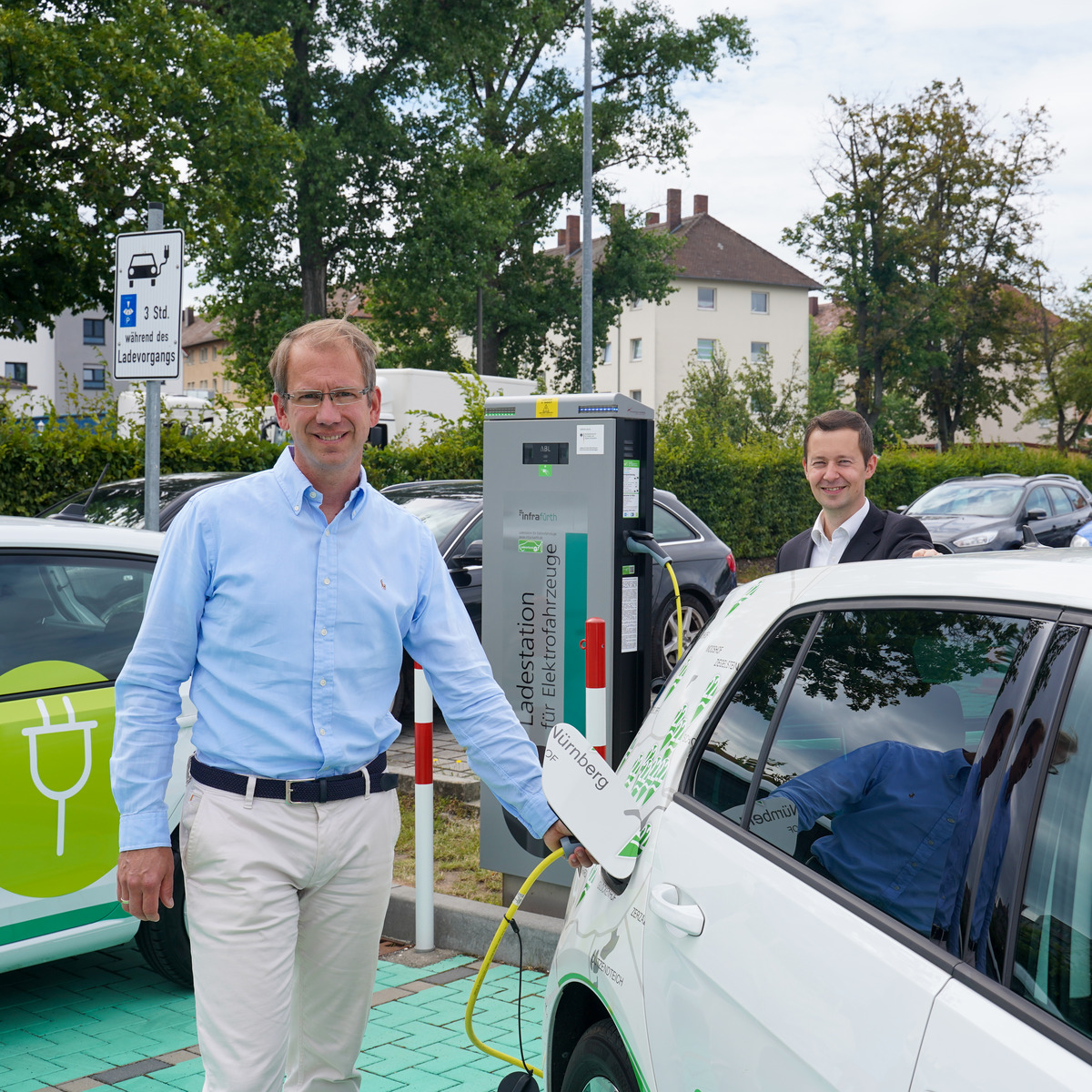 Auf dem Foto v.l.: Marcus Steurer (1. Vorsitzender des Ladeverbund+, Geschäftsführer der infra fürth gmbh) Markus Rützel (Koordinator des Ladeverbund+, Geschäftsführer der solid GmbH)