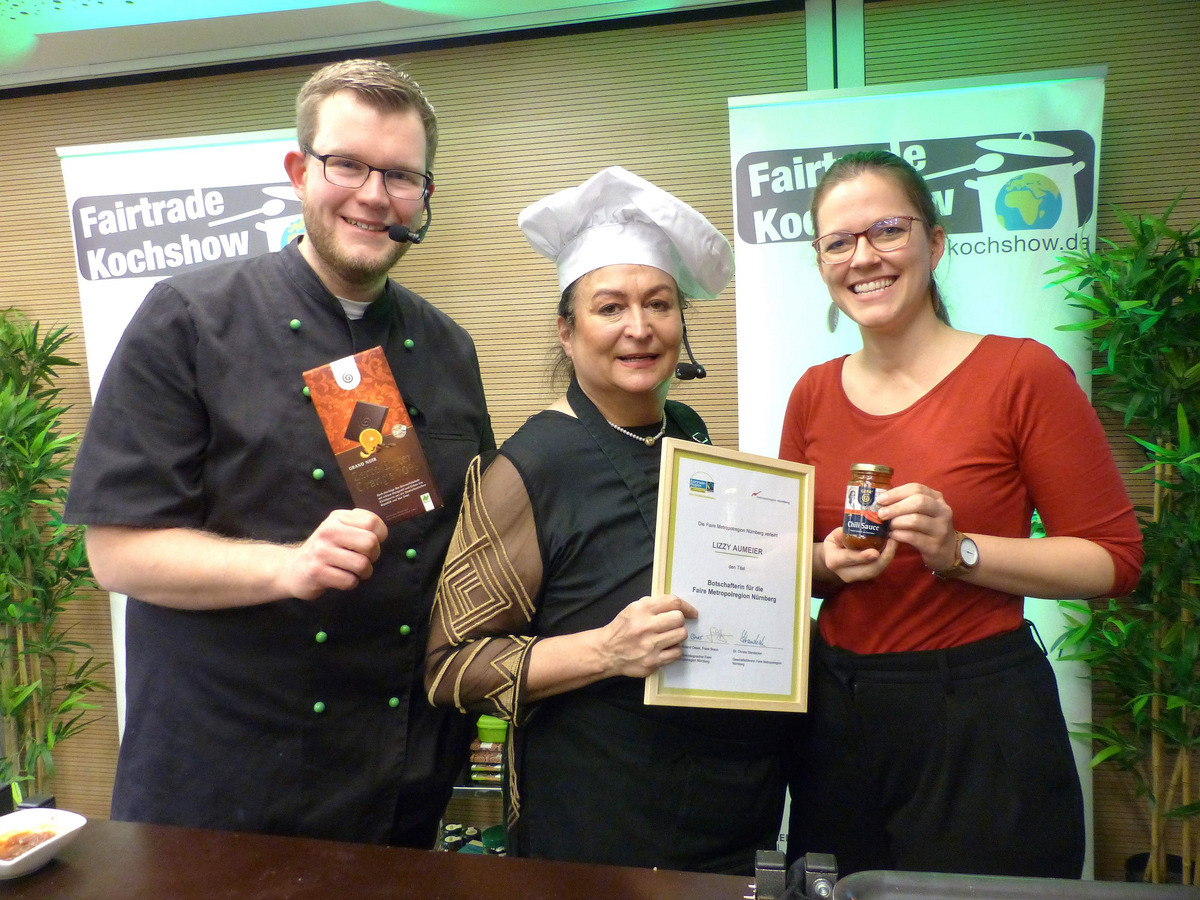 Am Mittwochabend, 5. Dezember 2018, fand im vollbesetzten Saal des Neumarkter Bürgerhauses erstmalig die Fairtrade Kochshow statt. Lizzy Aumeier trat nicht nur als Promiköchin auf, sondern wurde bei dieser Gelegenheit auch zur Botschafterin der Fairen Metropolregion Nürnberg ernannt. Mareike Grytz, Leiterin der Entwicklungsagentur Faire Metropolregion Nürnberg überreichte die Botschafterinnen-Urkunde im Namen der Initiativkreissprecher der Fairen Metropolregion und von Dr. Standecker, Geschäftsführerin der Metropolregion Nürnberg. Lizzy Aumeier freute sich sehr darüber und kommentierte: „Als ich gefragt wurde, ob ich Botschafterin für FAIRTRADE Produkte werden wolle, habe ich anfangs falsch verstanden und mir gedacht, passt doch, VERDREHT bin ich, sind wir doch alle irgendwie! Dann habe ich mir gedacht, wenn wir in unserer Verdrehtheit auf das wirkliche FAIRTRADE nur ein bisschen Augenmerk richten, ist schon viel getan!“
