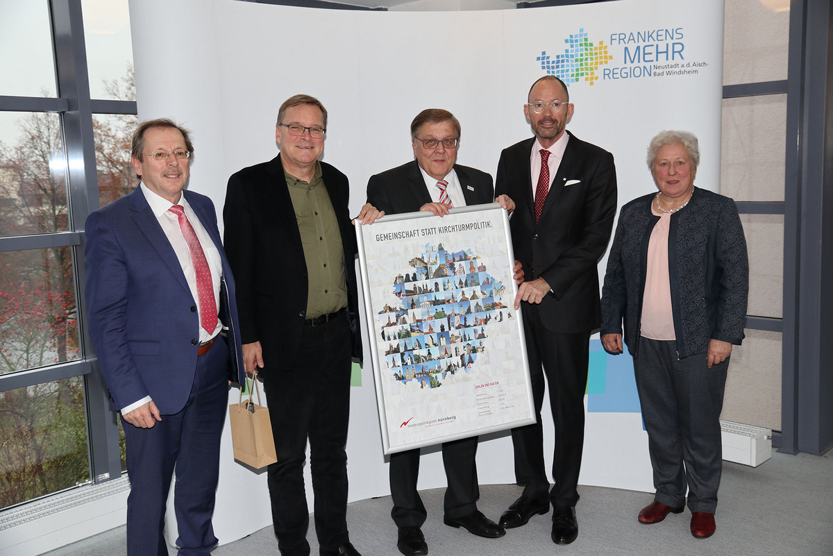 Vor den Abgeordneten des Kreistags, berichtete die Spitze der regionalen Allianz am Freitag, 30. November, über ausgewählte Projekte der Metropolregion Nürnberg im Landratsamt in Neustadt a.d. Aisch. Der Ratsvorsitzende der Metropolregion und Oberbürgermeister der Stadt Bamberg, Andreas Starke, sowie der Wirtschaftsvorsitzende Prof. Dr. Klaus L. Wübbenhorst berichteten über ausgewählte Projekte und warben für die überregionale Zusammenarbeit auf kommunalpolitischer Ebene. Die beiden Gäste lobten die gute Zusammenarbeit mit dem Landkreis Neustadt a.d. Aisch-Bad Windsheim. Als Gastgeschenk brachten der Ratsvorsitzende und der Wirtschaftsvorsitzende ein Metropolregionsplakat „Gemeinschaft statt Kirchturmpolitik“ mit, das als Zeichen der starken Verbundenheit des Landkreises mit der Metropolregion nun im Landratsamt hängen wird.