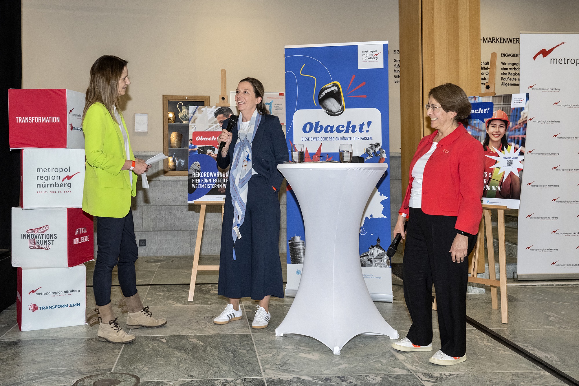 Anja Miller (Leiterin BR Franken, Mi.) und Herna Munoz Galeano (Gründerin und Geschäftsführerin PGXperts) sprachen mit Moderatorin Katrin Müller-Hohenstein (li.) über die Attraktivität der Metropolregion. Foto: Rudi Ott