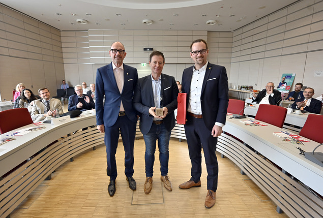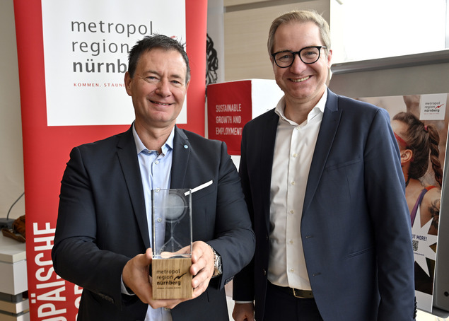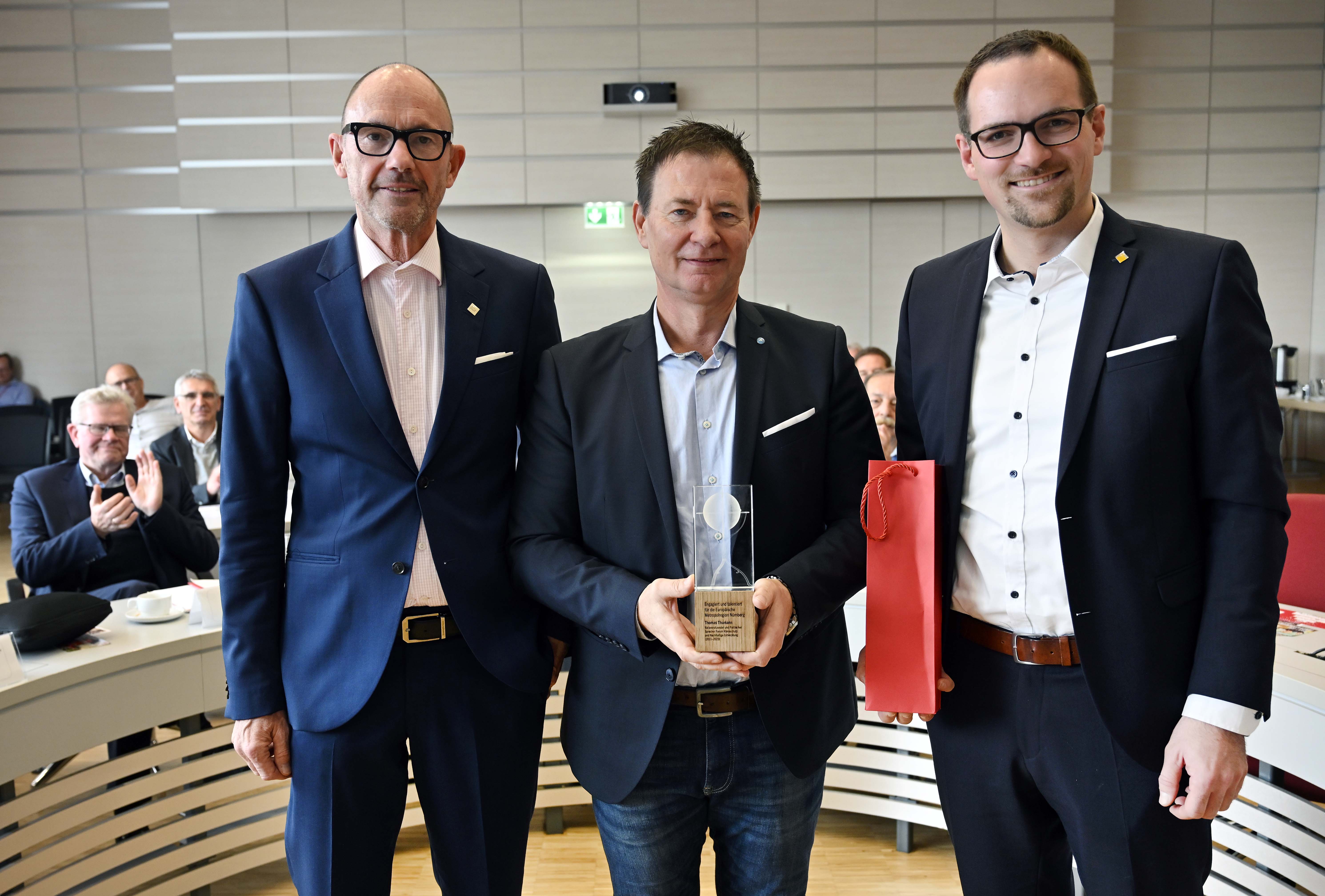 Peter Reiß (Ratsvorsitzender und OB der Stadt Schwabach; links) und Wirtschaftsvorsitzender Prof. Klaus L. Wübbenhorst überreichen den Metropolregions-Award an Alt-OB Thomas Thumann (Politischer Sprecher des Forums Klimaschutz) für sein langjähriges Engagement für die Metropolregion. Foto: Harald Sippel