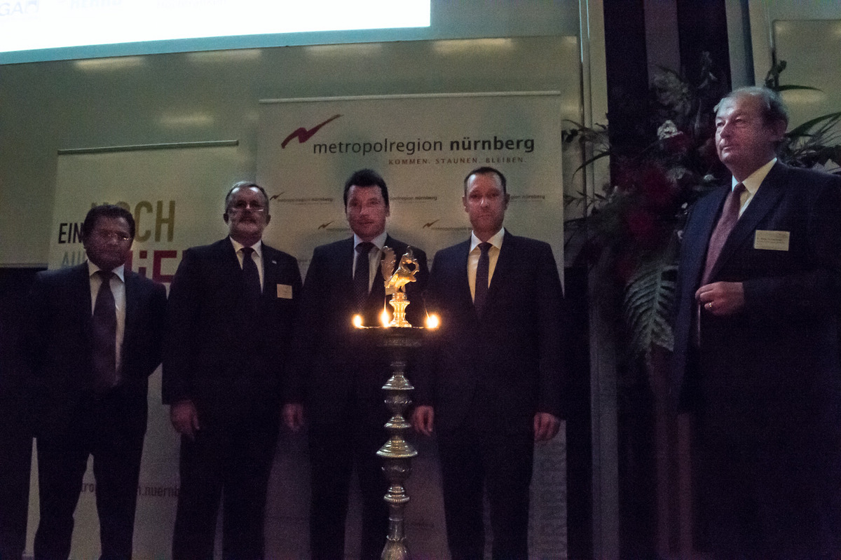 „Metropolregion goes India“ hieß in diesem Jahr ein Themenschwerpunkt des Wissenschaftstages der Metropolregion Nürnberg an der Hochschule Hof, der die Chancen eines deutsch-indischen Wissenstransfers für die Metropolregion aufzeigte. Deshalb eröffnete der indische Generalkonsul Sevala Naik die Veranstaltung mit einer Lichterzeremonie. Die Eröffnungsredner entzündeten jeweils einen Docht an einer indischen Messinglampe.