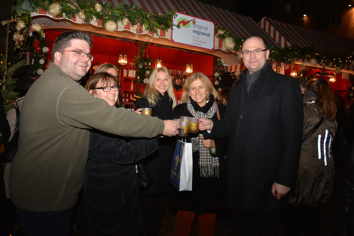 Gemütliche Glühweinrunde mit ungewöhnlichen Gästen: Albert Füracker, Staatssekretär im neu gegründeten bayerischen Heimatministerium mit Dienstsitz in Nürnberg, stattete mit einigen Mitarbeitern den Original-Regional-Buden auf dem Nürnberger Christkindlesmarkt einen Besuch ab.