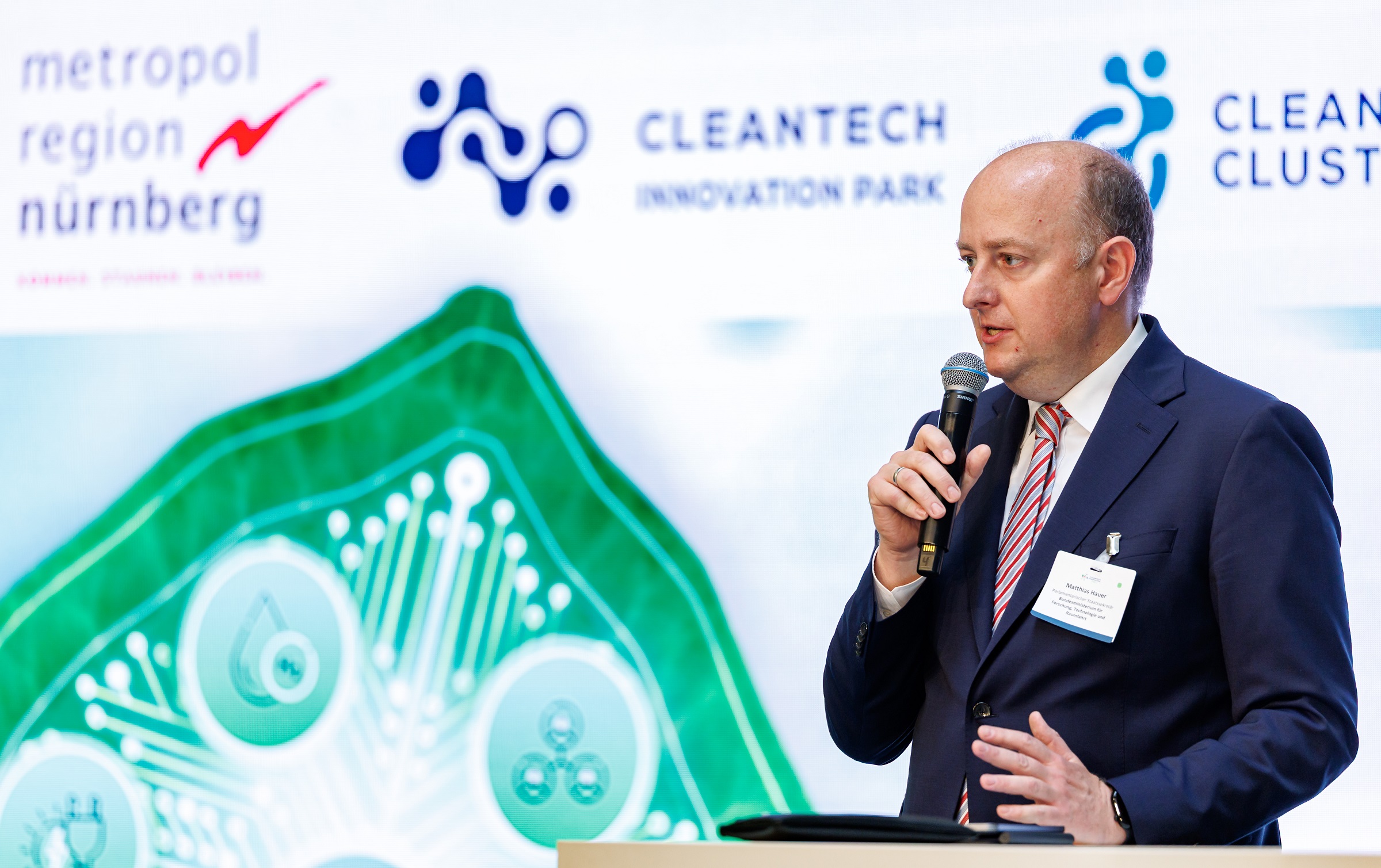 Wie kann sich die Metropolregion Nürnberg im Spannungsfeld von Klimakrise, Digitalisierung und Fachkräftemangel als europäisches Innovationszentrum positionieren? Wie gelingt es, regionale Unternehmen – insbesondere den Mittelstand – aktiv in Transformationsprozesse einzubinden? Diese und weitere Fragen rund um technologische Innovationen und eine klimaneutrale Zukunft in der Metropolregion Nürnberg diskutierten rund 200 Teilnehmende aus Wirtschaft, Wissenschaft und Politik beim dritten Cleantech Innovation Summit im kürzlich eröffneten Innovationszentrum am Cleantech Innovation Park in Hallstadt bei Bamberg.