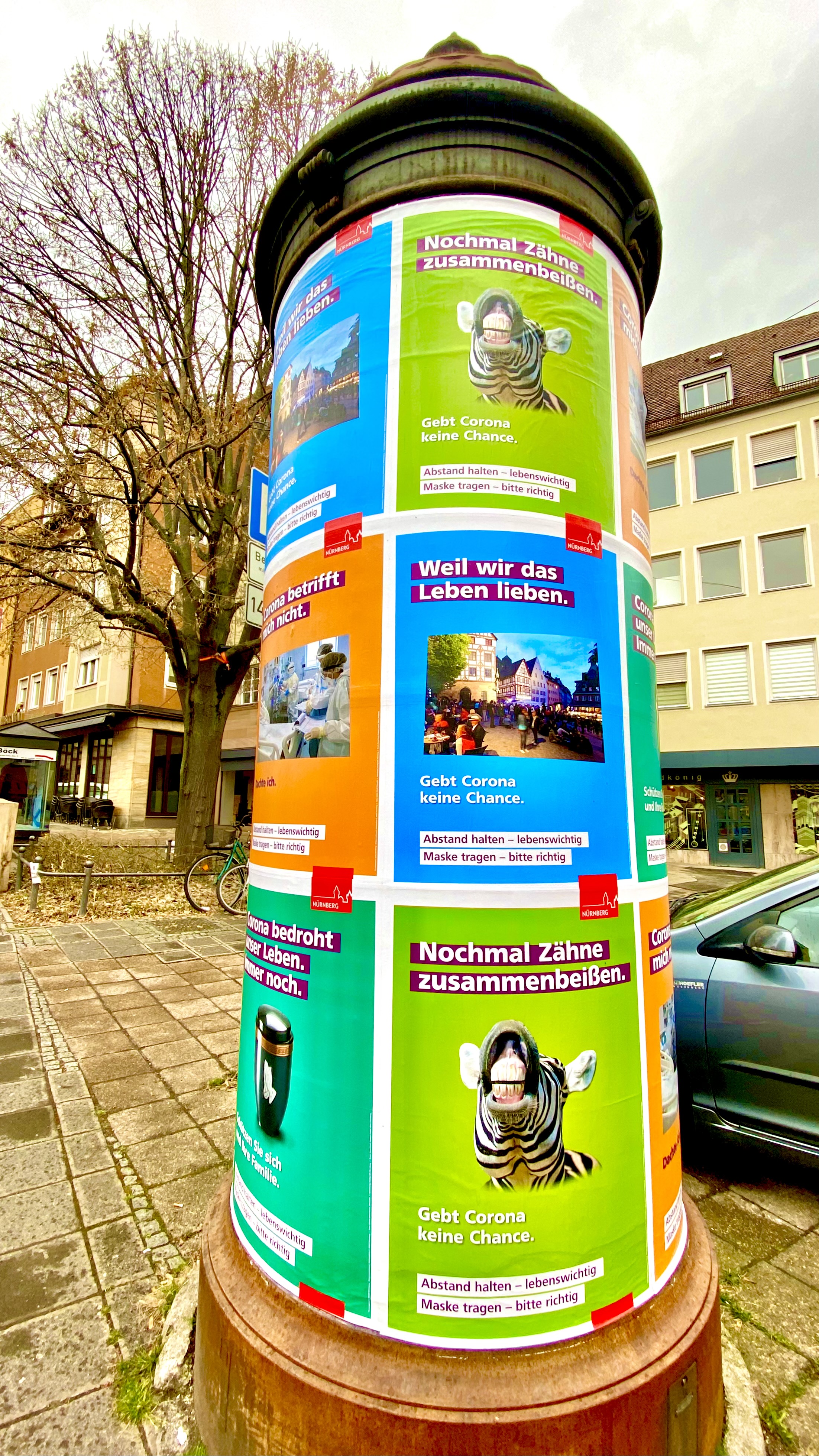 Diese Motive sollen Aufmerksamkeit und Achtsamkeit in der Corona-Pandemie in der Stadt Nürnberg hervorrufen: Ein Zebra scheint zu schreien "nochmal Zähne zusammenbeißen", eine Urne mit dem Untertitel "Corona bedroht unser Leben, immer noch", die Aussage "Corona betrifft mich nicht. Dachte ich" mit dem Bild einer Intensivstation und eine fröhliche Menschenansammlung auf dem beliebten Platz am Tiergärtnertor im Herzen von Nürnberg mit dem Text "weil wir das Leben lieben".