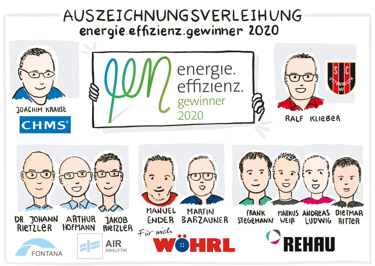 Die nordbayerischen energie.effizienz.gewinner 2020 aus der Metropolregion Nürnberg: CHMS GmbH & Co. KG, SC Uttenreuth 1923 e.V. (Sonderpreis Ehrenamt), Fontana GmbH & Co. KG / AIR Analytik Institut Rietzler GmbH, Rudolf Wöhrl SE und REHAU AG + Co; Grafik: ENERGIEregion Nürnberg e.V. / Susanne Kitlinski
