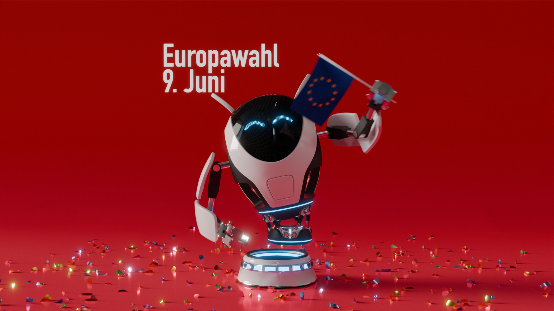 #NutzeDeineStimme - im Video schwenkt dieser Roboter, gestaltet und animiert in der Metropolregion Nürnberg in Ebersdorf bei Coburg von der Agentur "Logan Five", die Europa-Fahne und die Fahne der Europäischen Metropolregion Nürnberg. Er ruft auf, am 9. Juni 2024 zur Europawahl zu gehen.