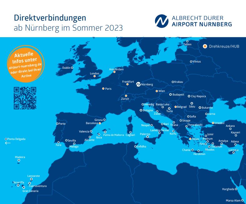 Zieleübersicht Sommer ab Flughafen Nürnberg: Die vorläufige Übersicht aller Nonstop-Ziele ab Flughafen Nürnberg für den Sommer 2023. (Stand Dezember 2022)