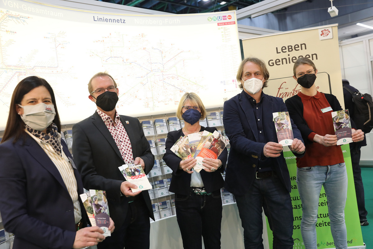 Auf der Freizeit Messe vom 9. bis 13. März 2022 stellt der VGN die neue Buslinie „Fränkische-Toskana-Express“ (970) ins Bamberger Land und dazu passende Wandermöglichkeiten vor. Zum Startschuss der Messe präsentierten am Mittwoch, 9. März Anja Steidl, Geschäftsführerin VGN, Stellv. Landrat Bruno Kellner (Landkreis Bamberg) sowie der Bürgermeister von Strullendorf, Wolfgang Desel, und Bianca Müller, Tourismus Managerin der Fränkischen Toskana die neue Linie sowie touristische Highlights des Gebiets um die Gemeinden Strullendorf, Litzendorf und Memmelsdorf, auch bekannt als Fränkische Toskana.
