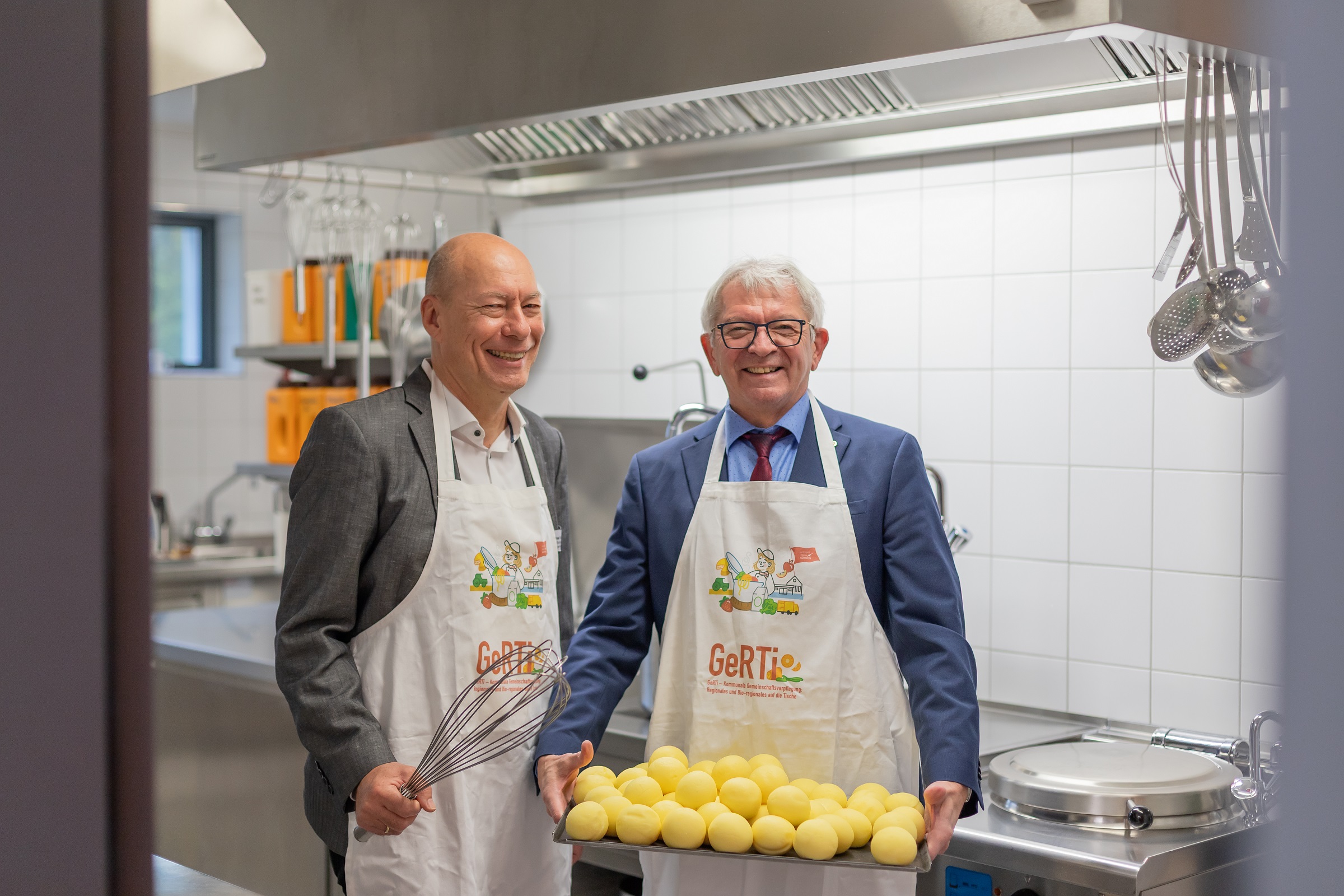 Buttenheims Bürgermeister Michael Karmann (links) sowie Bambergs Landrat und GeRTi-Projektpate Johann Kalb kümmern sich um gutes regionales und bio-regionales Essen in der Schule Buttenheim (Foto: Frederik Hildner)