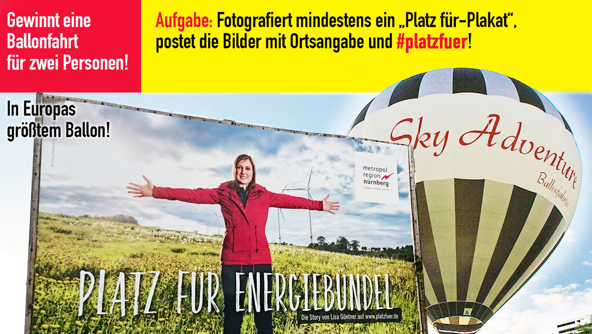 In den kommenden Tagen werden auf 157 Großflächen in 24 Orten der Metropolregion Nürnberg verschiedene Motive der Kampagne "Platz für" zu sehen sein. Im Zuge dieser Großflächen-Werbeaktion verlost die Geschäftsstelle der Metropolregion Nürnberg einen Gutschein für eine Ballonfahrt für zwei Personen von Sky Adventure Ballonfahrten.