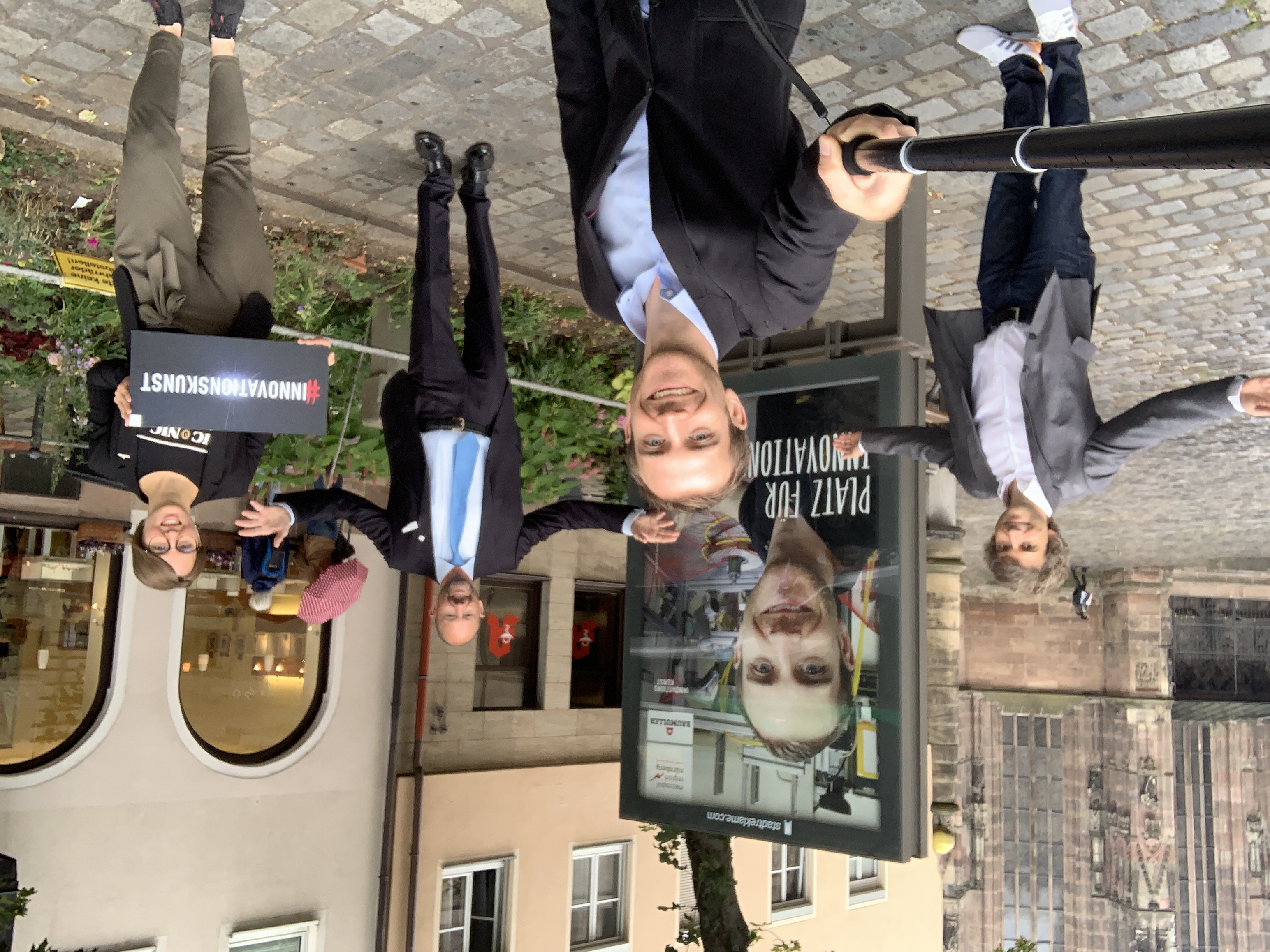 Platz für Innovationskünstler in der Nürnberger Innenstadt: v.l.n.r.: Nicolas Kubanek, Projektleiter Initiative Innovationskunst; Innovationskünstler Felix Wieser, Prozessoptimierer bei der Baumüller Gruppe; Prof. Dr. Klaus L. Wübbenhorst, Wirtschaftsvorsitzender der Europäischen Metropolregion Nürnberg; Anja Andraschko, Messe- und Onlinemarketing bei der Baumüller Gruppe