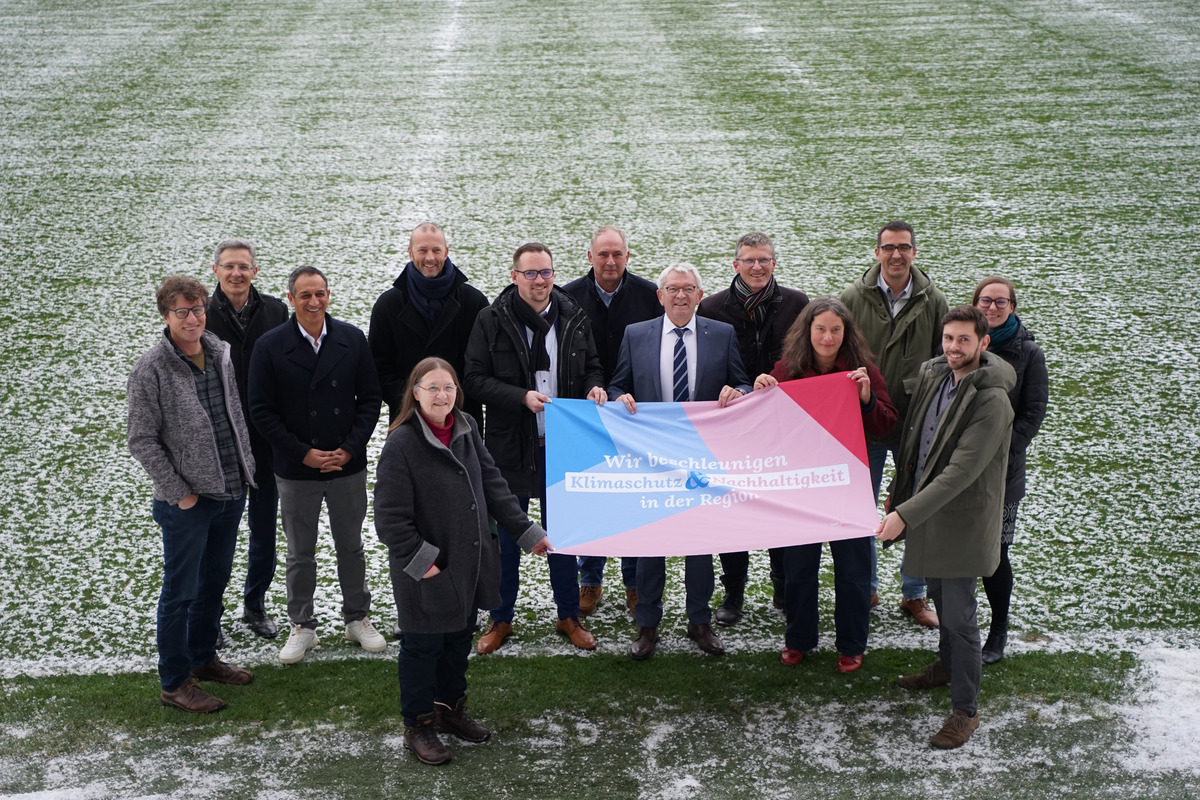 Matthias Hüttmann (DGS), Ignacio Ugarte (Stadt Erlangen), Richad Azzouzi (SpVgg Greuther Fürth), Niels Rossow (1. FC Nürnberg), Barbara Poneleit (Landkreis Forchheim), Oberbürgermeister Peter Reiß (Stadt Schwabach), Dr. Roland Lindacher (Landkreis Forchheim), Landrat Johann Kalb (Landkreis Bamberg), Stefan Jessenberger (Energiewende ER(H)langen), Sabine Bock (Stadt Erlangen), Stefan Seufert (DGS), Andreas Eichenseher (Geschäftsführer), Tamara Moll (Landkreis Bamberg); (Foto: Unser Klimafonds / Europäische Metropolregion Nürnberg)