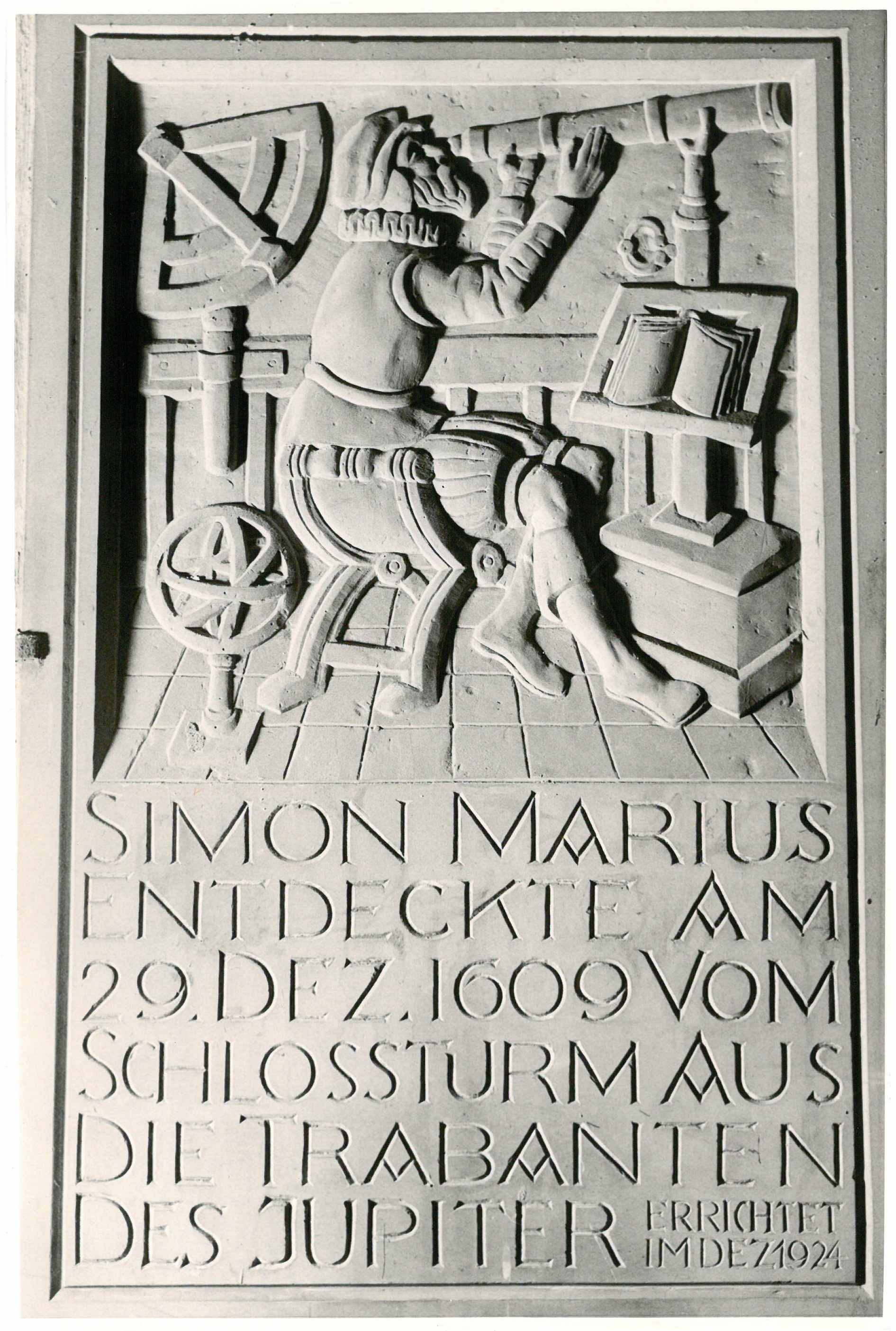WANDTAFEL IN ANSBACH Am Ansbacher Schloss verweist seit 1924 eine Wandtafel darauf, dass Marius der Legende nach seine ersten Jupitermondbeobachtungen vom Schlossturm aus gemacht habe. Es heißt: „Simon Marius entdeckte am 29. Dez. 1609 vom Schlossturm aus die Trabanten des Jupiter“. Der 29.12.1609 entspricht im gregorianischen Kalender dem 08.01.1610. Bildvermerk: Stadtarchiv Ansbach