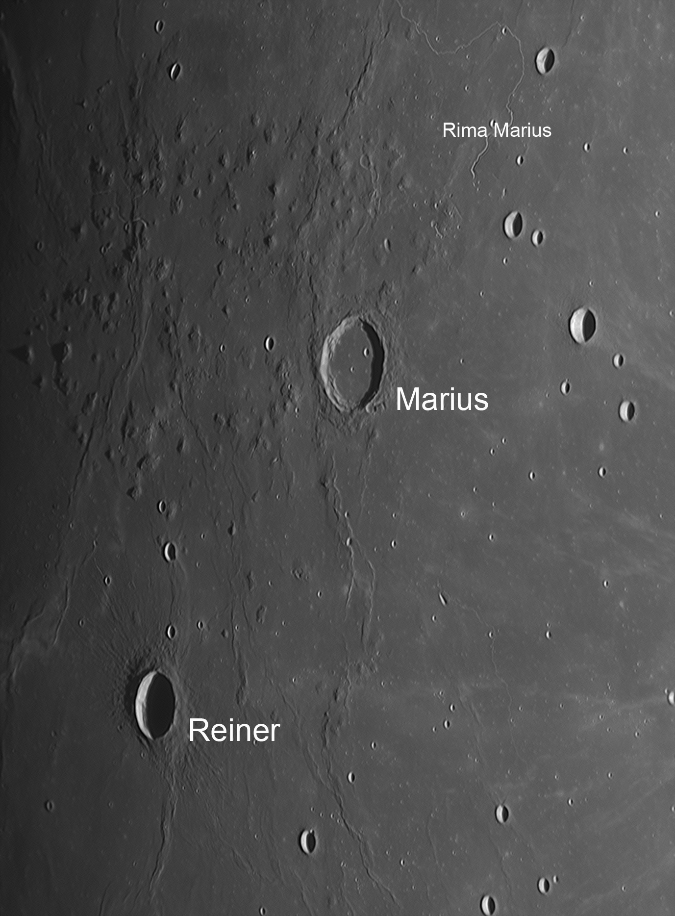 MONDKRATER MARIUS Auf der westlichen, der Erde zugewandten Seite des Mondes befindet sich der Oceanus Procellarum (Ozean der Stürme). Er ist das größte Mare (Mondmeer), eine große durch überfließendes Magma gebildete Ebene, in der sich ein 40 km großer Einschlagkrater befindet, der nach Simon Marius benannt wurde. Das Foto zeigt ihn nordöstlich des Kraters Reiner. Die Aufnahmedaten sind: 14.03.2014, 22:51 Uhr, Teleskop: Mira (40 cm Cassegrain), Sekundärfokus: Brennweite eff. 3600 mm, Kamera: CCD-Kamera ASI120MM, Belichtung: Summenbild aus 200 Einzelbildern mit je 3 ms Belichtungszeit. Eine Liste der Nebenkrater und Bilder, die vom Lunar Reconnaissance Orbiter und Apollo 12 aufgenommen wurden, finden sich auf Wikipedia. Bildvermerk: Marius-Portal/Bernd Liebscher