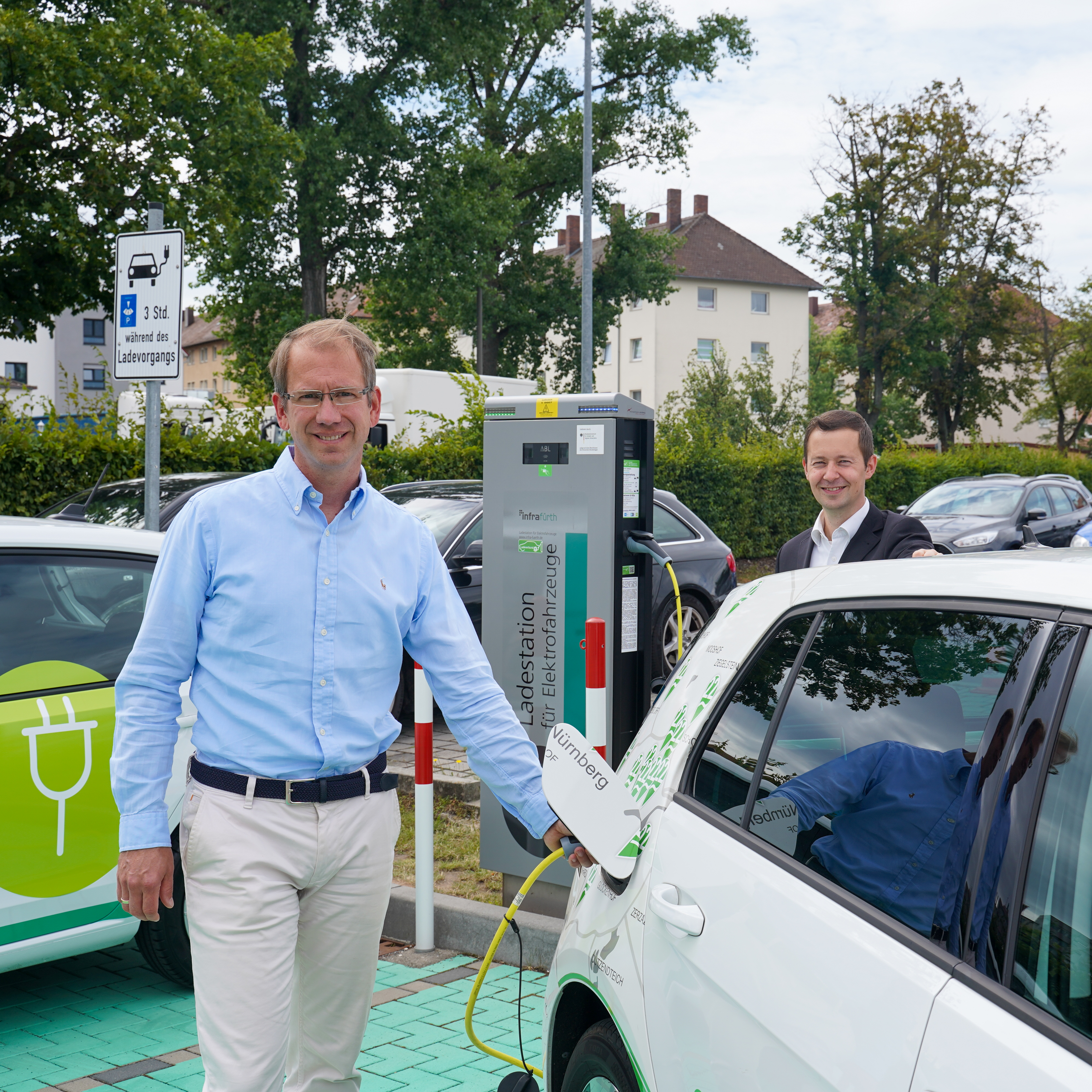 Auf dem Foto v.l.: Marcus Steurer (1. Vorsitzender des Ladeverbund+, Geschäftsführer der infra fürth gmbh) Markus Rützel (Koordinator des Ladeverbund+, Geschäftsführer der solid GmbH)