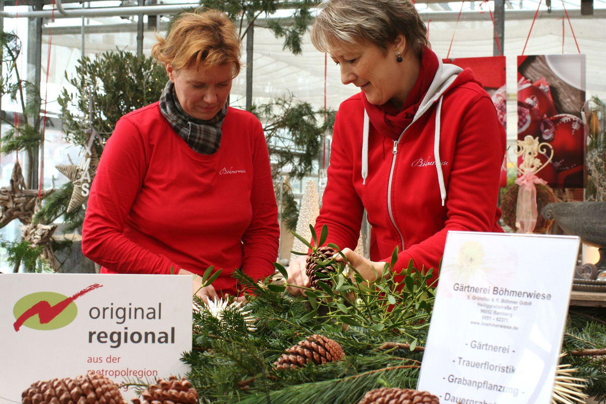 Auch die Dekoration der Buden stammt wie immer aus der Region. Die Gärtnerei Böhmerwiese, Mitglied der Original-Regional-Partnerinitiative „Bamberger Gärtner“, ist gerade dabei, die Girlanden aus heimischen Tannen zu schnüren.