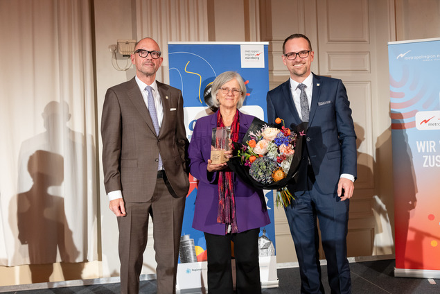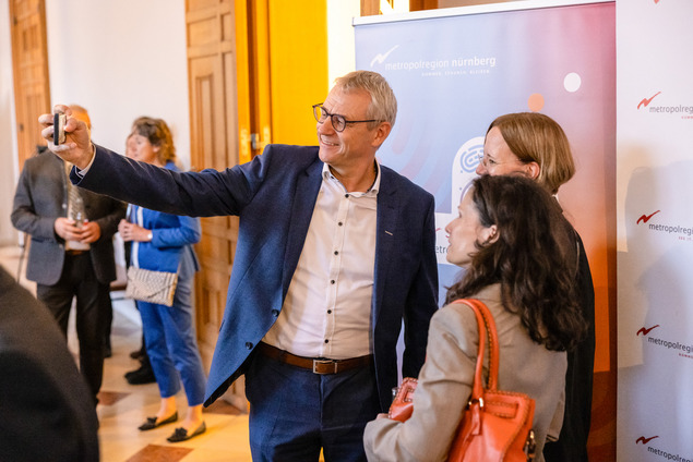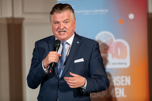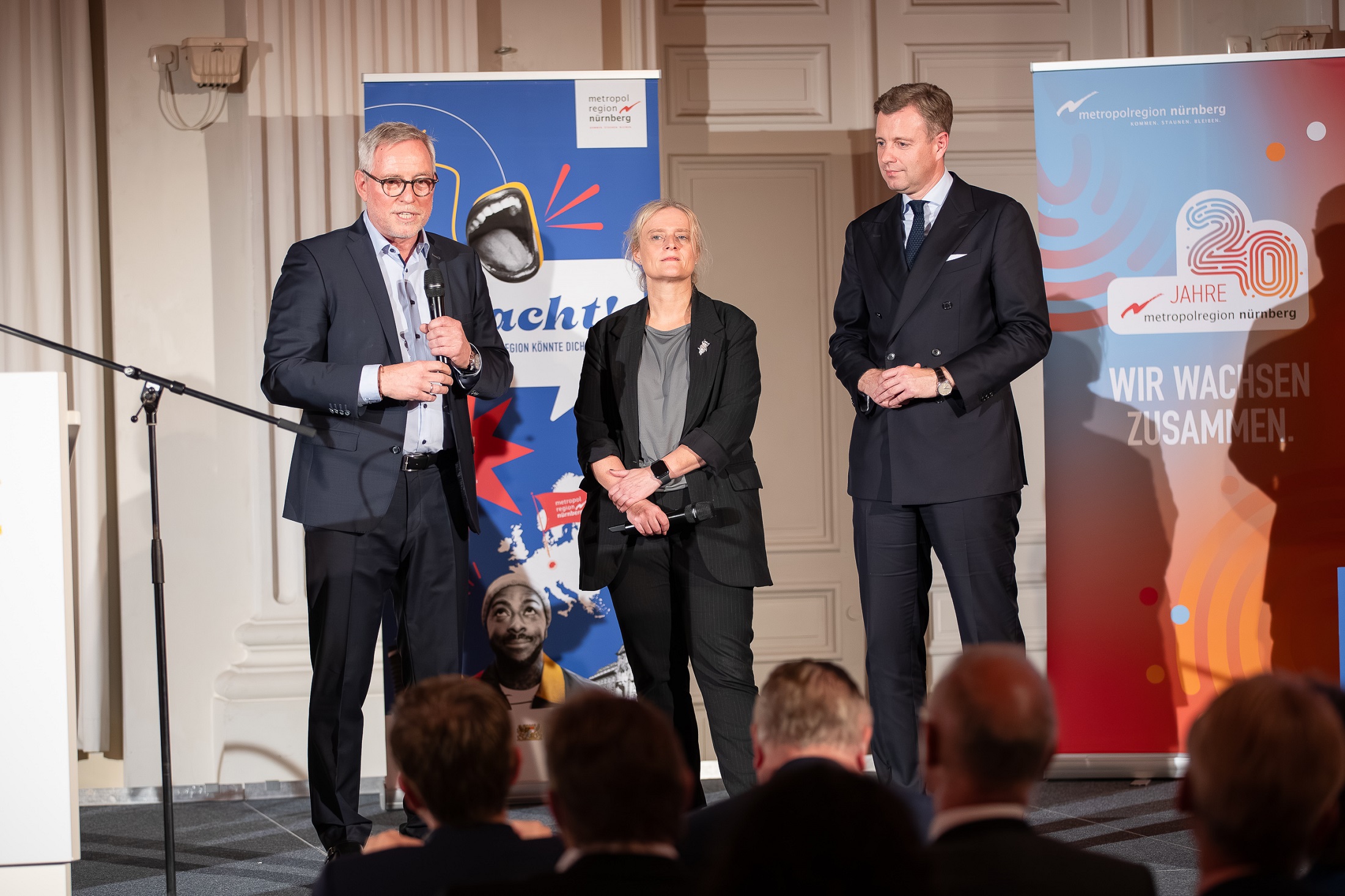 Nürnbergs Oberbürgermeister Marcus König freute sich über den Zusammenhalt: „Die Europäische Metropolregion Nürnberg ist der Zusammenschluss vieler, die ein Ziel eint: Wir bringen gemeinsam die Region voran – mit großen Städten und ländlichen Räumen. Wir bieten Innovation, Lebensqualität und Zukunft. Unser Motto ist daher: Kommen. Staunen. Bleiben.“ Die Herausforderungen bleiben schließlich groß. „Die Transformation der Automobilbranche, Energie- und Mobilitätswende sowie Digitalisierung und Nachhaltigkeit fordern regionale Kooperationen. Um wettbewerbsfähig zu bleiben, kooperieren auch Unternehmen verstärkt untereinander sowie mit unseren Hochschulen und Forschungseinrichtungen“, erklärte Dr. Christa Standecker. Die Geschäftsführerin der Europäischen Metropolregion Nürnberg wurde an dem Abend mit dem Metropolregion-Award ausgezeichnet, als starke, treibende Kraft an der Spitze in den vergangenen 20 Jahren.
