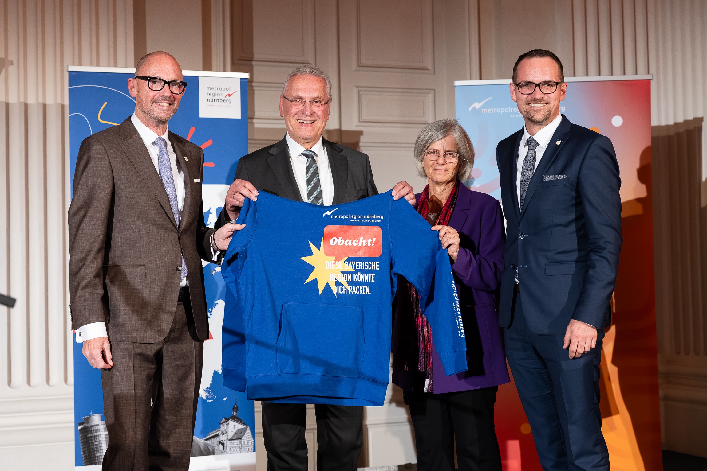 Innenminister Joachim Herrmann (2. von links) präsentiert sein Geschenk, einen blauen Hoodie, den ihm Prof. Klaus L. Wübbenhorst (li.), Dr. Christa Standecker und Peter Reiß überreichten. Foto: Simon Geiger