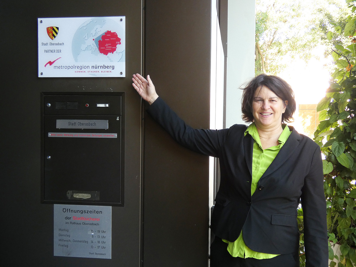 So können Kommunen ihre Verbundenheit mit der Metropolregion Nürnberg zeigen: Die Erste Bürgermeisterin der Stadt Oberasbach, Birgit Huber, nutzt das Willkommensschild der Metropolregion.