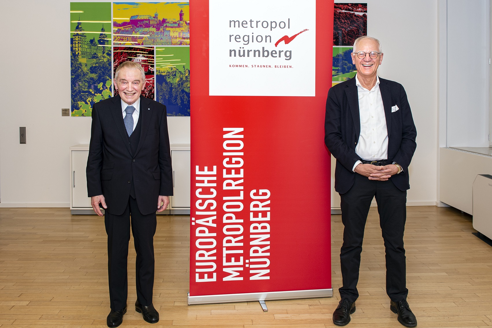 Einen Wechsel gab es im Kuratorium des Fördervereins: Prof. Dr. Siegfried Balleis wurde zum neuen Vorsitzenden gewählt. Der Alt-OB der Stadt Erlangen ist einer der Gründungsväter der Metropolregion, der sich seit Jahren für die regionale Allianz stark macht. Von 2011 bis 2014 war er Ratsvorsitzender. „Ich freue mich sehr darauf, mich in der neuen Funktion für den Förderverein und die Metropolregion zu engagieren“, sagte Prof. Balleis. Sein Vorgänger Hans-Peter Schmidt verabschiedete sich nach mehr als 23 Jahren Engagement für die Region, das 1999 mit dem Kuratoriumsvorsitz des Marketingvereins der Region Nürnberg begann. Der ehemalige Vorstands- und Aufsichtsratsvorsitzende der Nürnberger Versicherung war einer der Initiatoren der Metropolregion und setzte sich über viele Jahre für deren Entwicklung ein. Das Kuratorium berät den Vorstand des Fördervereins Wirtschaft in wichtigen und grundlegenden Angelegenheiten des Vereins.