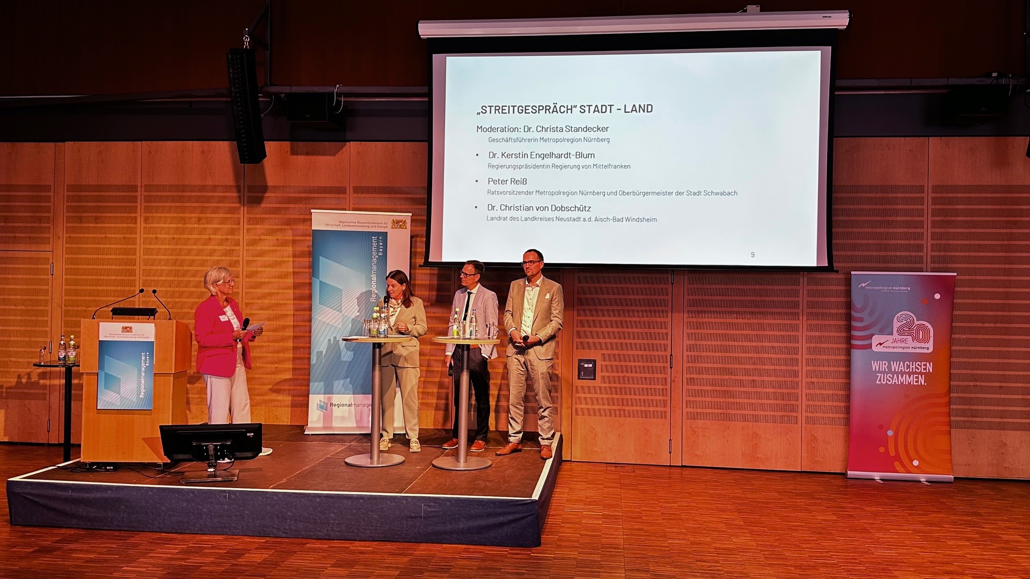Ende September boten nun in Bad Windsheim Vorträge, Infostände, Workshops und ein Besuch des Fränkischen Freilandmuseums die Gelegenheit zum Austausch und zur Vernetzung. In einer Podiumsdiskussion reflektierten Dr. Kerstin Engelhardt-Blum (Regierungspräsidentin Regierung von Mittelfranken), Peter Reiß (Ratsvorsitzender Metropolregion Nürnberg und Oberbürgermeister der Stadt Schwabach) und Dr. Christian von Dobschütz (Landrat des Landkreises Neustadt a.d. Aisch – Bad Windsheim) unter Moderation von Dr. Christa Standecker (Geschäftsführerin Metropolregion Nürnberg) den Mehrwert und die Erfolge der Metropolregion Nürnberg.