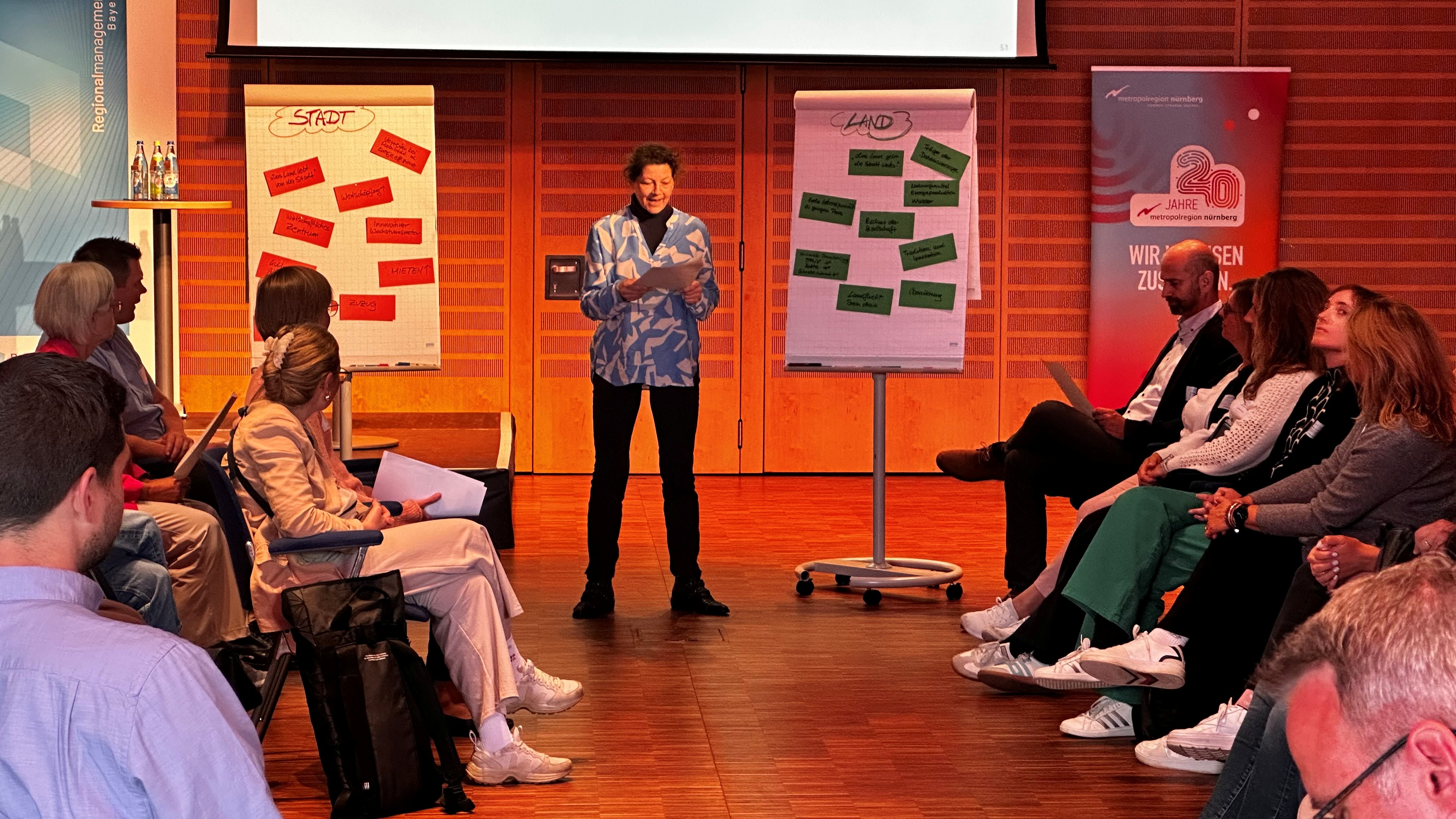 Stadt oder Land? Die Regionalmanager diskutierten und tauschten ihr Wissen aus. Im Bild Dr. Patricia Schläger-Zirlik von der Geschäftsstelle der Metropolregion Nürnberg moderiert einen der Workshops. Foto: Bayerisches Staatsministerium für Wirtschaft, Landesentwicklung und Energie StMWi/N. Cwikla