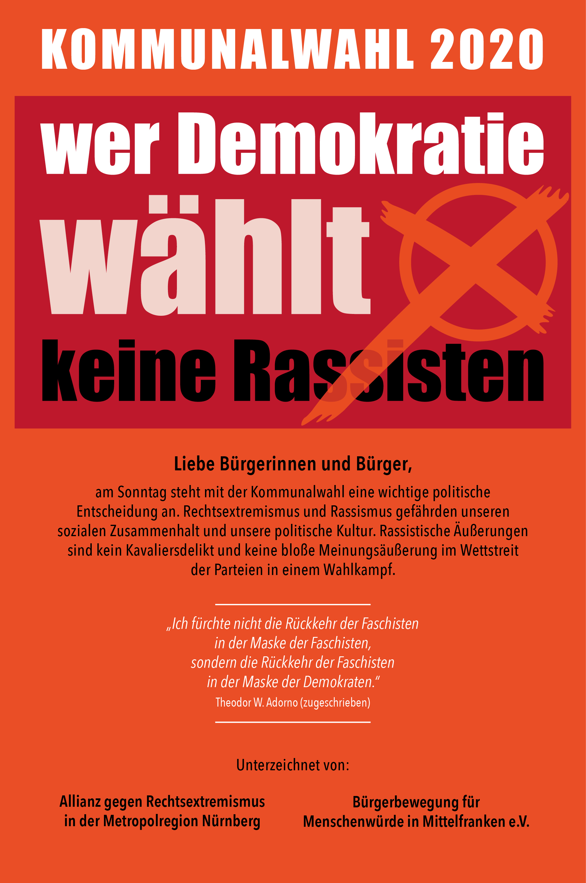 Die Allianz gegen Rechtsextremismus in der Metropolregion Nürnberg und die Bürgerbewegung für Menschenwürde in Mittelfranken e.V. rufen zur Beteiligung an der Kommunalwahl 2020 auf und warnen vor Rechtsextremismus und Rassismus.