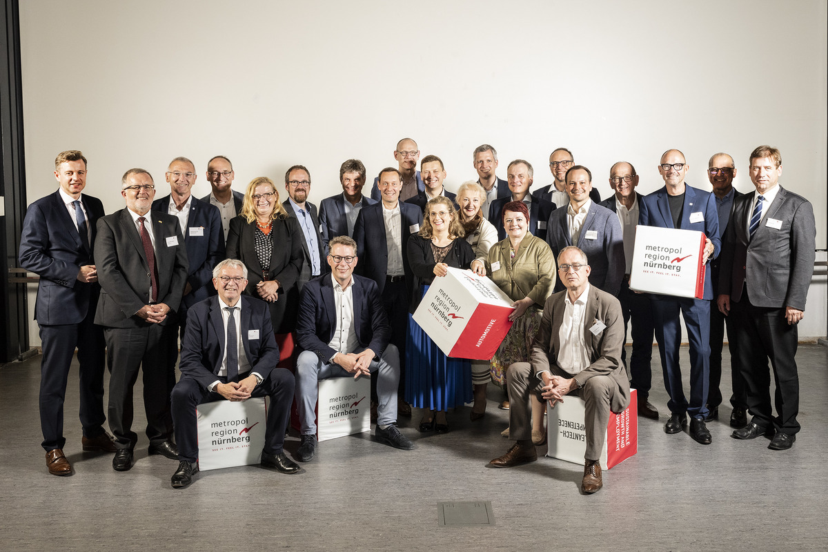 Der Wissenschaftstag der Europäischen Metropolregion Nürnberg in Erlangen hat Gäste aus Wissenschaft, Wirtschaft und Politik angezogen (von links nach rechts): Dr. Oliver Bär (Landrat Hof und politischer Sprecher des Forums Wissenschaft der Metropolregion Nürnberg), Prof. Dr. Jürgen Lehmann (Präsident Hochschule Hof), MdL Wolfgang Hauber, Johann Kalb (Landrat Bamberg und Ratsvorsitzender der Metropolregion, sitzend), MdL Bernhard Seidenath, MdL Gabi Schmidt, Oberbürgermeister Dr. Florian Janik (Erlangen), Wissenschaftsminister und MdL Markus Blume, (sitzend), Prof. Dr. Joachim Hornegger (FAU-Präsident), Bezirkstagspräsident und Landrat Nürnberger Land Armin Kroder, Dr. Bernd Montag (CEO Siemens Healthineers), Parl. Staatssekretär im BMBF Mario Brandenburg (MdB), MdB Kristine Lütke, MdL Petra L. Guttenberger, MdL Christian Zwanziger, MdL Verena Osgyan, Horst Müller (Fürther Wirtschaftsreferent und Geschäftsführer des Forums Wissenschaft der Metropolregion Nürnberg), Marco Wendel (Medical Valley), Prof. Dr. Stefan Leible (Präsident Uni Bayreuth und fachlicher Sprecher des Forums Wissenschaft der Metropolregion Nürnberg, sitzend), MdL Matthias Fischbach, Prof. Dr. Albert Heuberger (Fraunhofer IIS), Prof. Dr. Klaus L. Wübbenhorst (Wirtschaftsvorsitzender der Metropolregion Nürnberg), Michael Sigmund (Siemens) und Landrat Dr. Herrmann Ulm (Forchheim) Fotograf: Rudi Ott