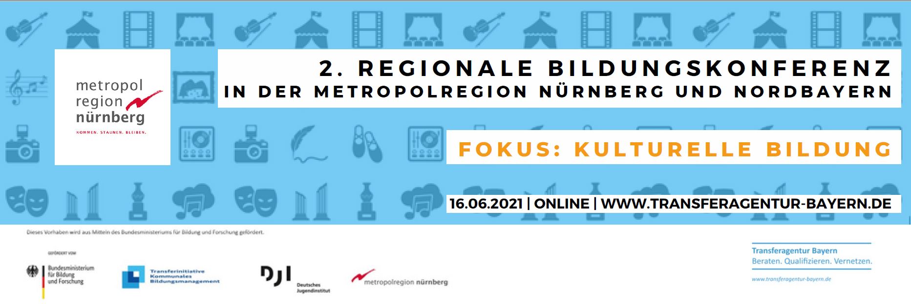 Am Mittwoch, 16. Juni 2021, zwischen 10:00 bis 15:00 Uhr findet als Online-Veranstaltung die 2. Regionale Bildungskonferenz 2021 in der Metropolregion Nürnberg und Nordbayern statt. Eingeladen sind alle, die sich in den Bereichen Jugend und Soziales, Schule, Bildung sowie Kultur bereits mit dem Thema kulturelle Bildung befassen oder in Zukunft befassen möchten.