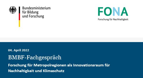 Am Montag, 04. April 2022 von 09:30 bis 16:00 Uhr findet das BMBF Fachgespräch: Forschung für Metropolregionen als Innovationsraum für Nachhaltigkeit und Klimaschutz statt.