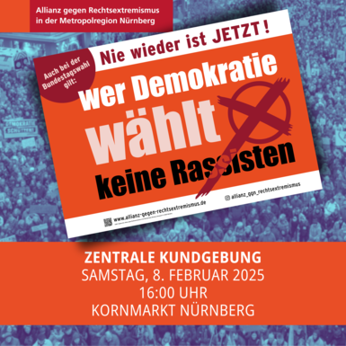 Unter dem Motto „Nie wieder ist JETZT! Wer Demokratie wählt, wählt keine Rassisten!“ – lädt die Allianz gegen Rechtsextremismus in der Metropolregion Nürnberg zu einer zentralen Kundgebung am 8. Februar nach Nürnberg ein.