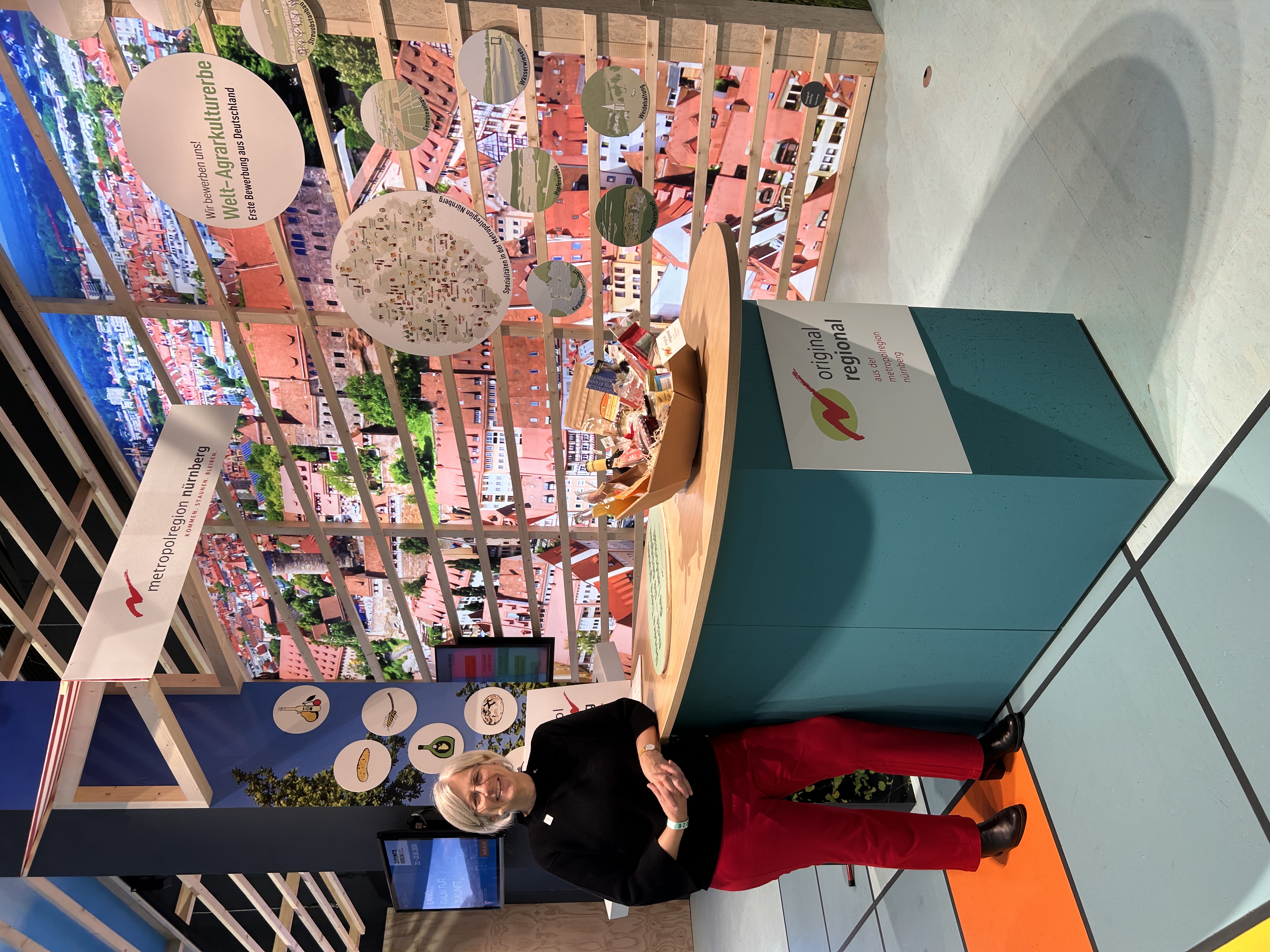 Integriert in den Auftritt des Bundeslandwirtschaftsministeriums in Halle 23 a präsentiert sich die Metropolregion Nürnberg mit ihrer Bewerbung als Welt-Agrarkulturerbe am Stand 314. Auf einem Touch-Screen können die Besucherinnen und Besucher mehr erfahren über die vielfältige Land- und Ernährungswirtschaft in der Metropolregion Nürnberg. Spannende Fakten zu Karpfenteichwirtschaft, Streuobstwiesenanbau, Hopfengärten u.ä. werden unterhaltsam präsentiert. Bei einer Fotobox hat jede:r die Möglichkeit, sich mit seinem Lieblings-Produkt verewigen zu lassen und kann das Foto gleich mitnehmen.