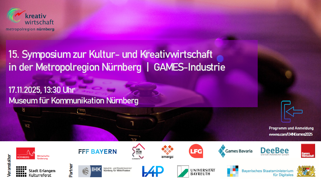 Am 17. November 2025 findet im Museum für Kommunikation Nürnberg das nächste Symposium zur Kultur- und Kreativwirtschaft in der Metropolregion Nürnberg statt. Im Fokus: die Gamesbranche – ein Event für Austausch und Vernetzung kreativer Köpfe in der Metropolregion Nürnberg.