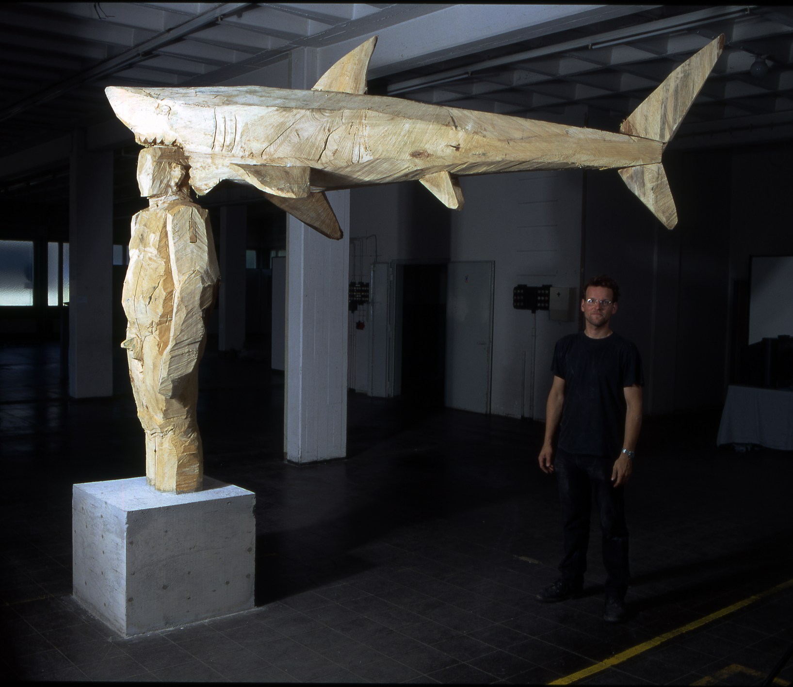 Ein überlebensgroßer Mann aus Pappelholz, die Beine stecken in einem Betonklotz, sein Kopf verschwindet im Maul eines riesigen Hais, der sich im 90 Grad-Winkel von der menschlichen Figur wegspreizt. Kunstinteressierte der Metropolregion wissen sofort, was sie vor sich haben: Eine Skulptur von Christian Rösner. Den in Bamberg geborenen, in Nürnberg lebenden Bildhauer zeichnen seine konsequente Formensprache sowie sein stetes Ringen um bildhauerische Fragestellungen aus. Seine Inhalte sind teils verstörend, teils humoristisch.