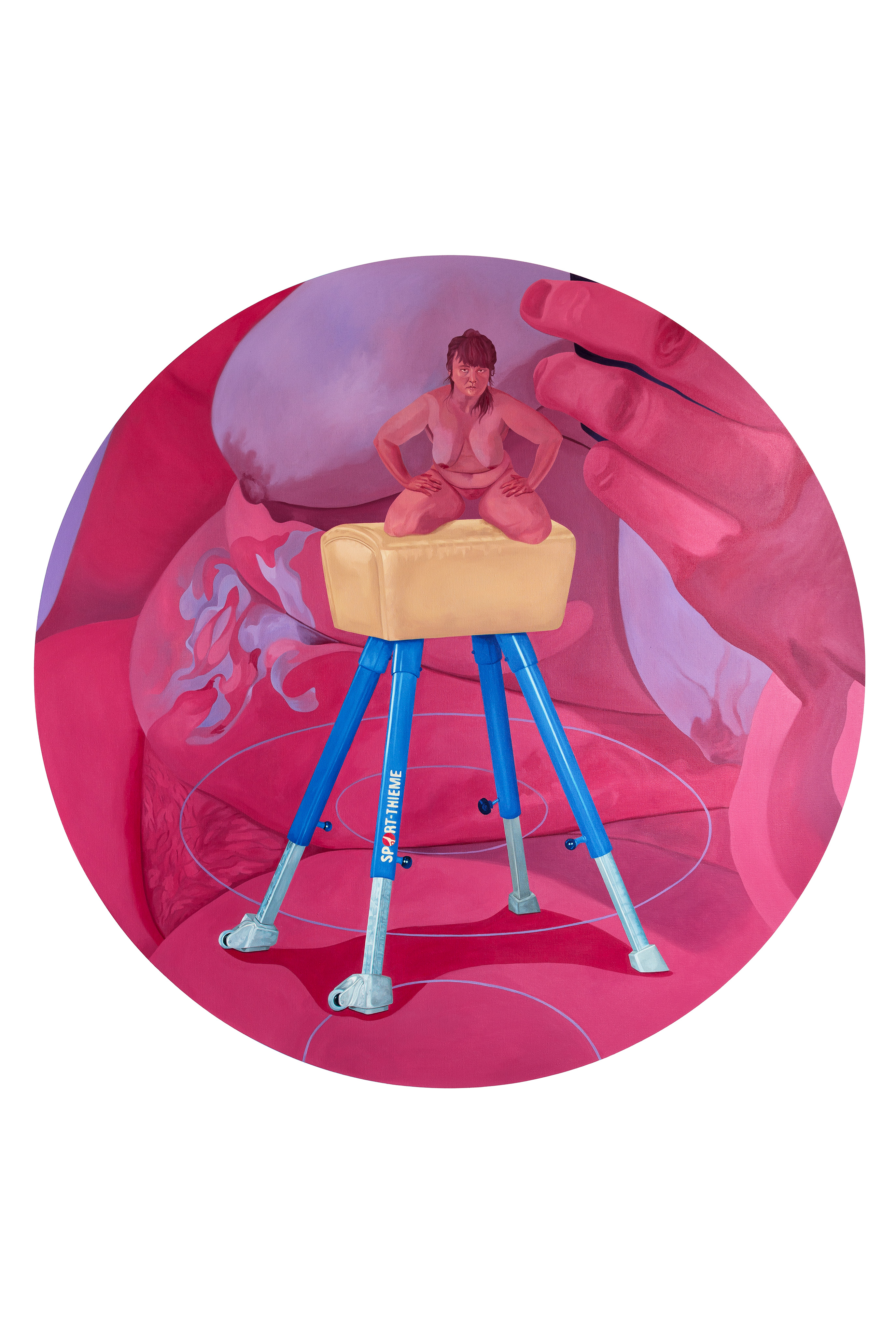Zuweilen wählt die Künstlerin für ihre Gemälde das Format des Tondos, das folgerichtig erscheint, wenn man an ihre Fokussierung auf die Kameralinse des Handys denkt. Batteux‘s lasierende Malerei nutzt dafür eine Farbpalette, die großteils aus intensiven Rosa-, Blau- und Violettönen besteht. Rot für das Innere, den Mutterleib und inhaltlich auch immer für das Schützende. Blau hingegen als starker Kontrast und nicht nur ästhetisch ein Gegenpol. Den Bildaufbau beginnt sie mit dem Hintergrund und setzt die Figuren ihrer Werke dann sehr bewusst in das Format – und passt deren Größe der Aussage an: Bei dem Werk „Der Bock ist ein mieser Verräter“ beispielsweise ist der Maßstab Inhaltträger, denn die Figur ist maßstäblich zu klein in Relation zu dem Turngerät, das somit ein surreales Element und zugleich Angstobjekt ist.