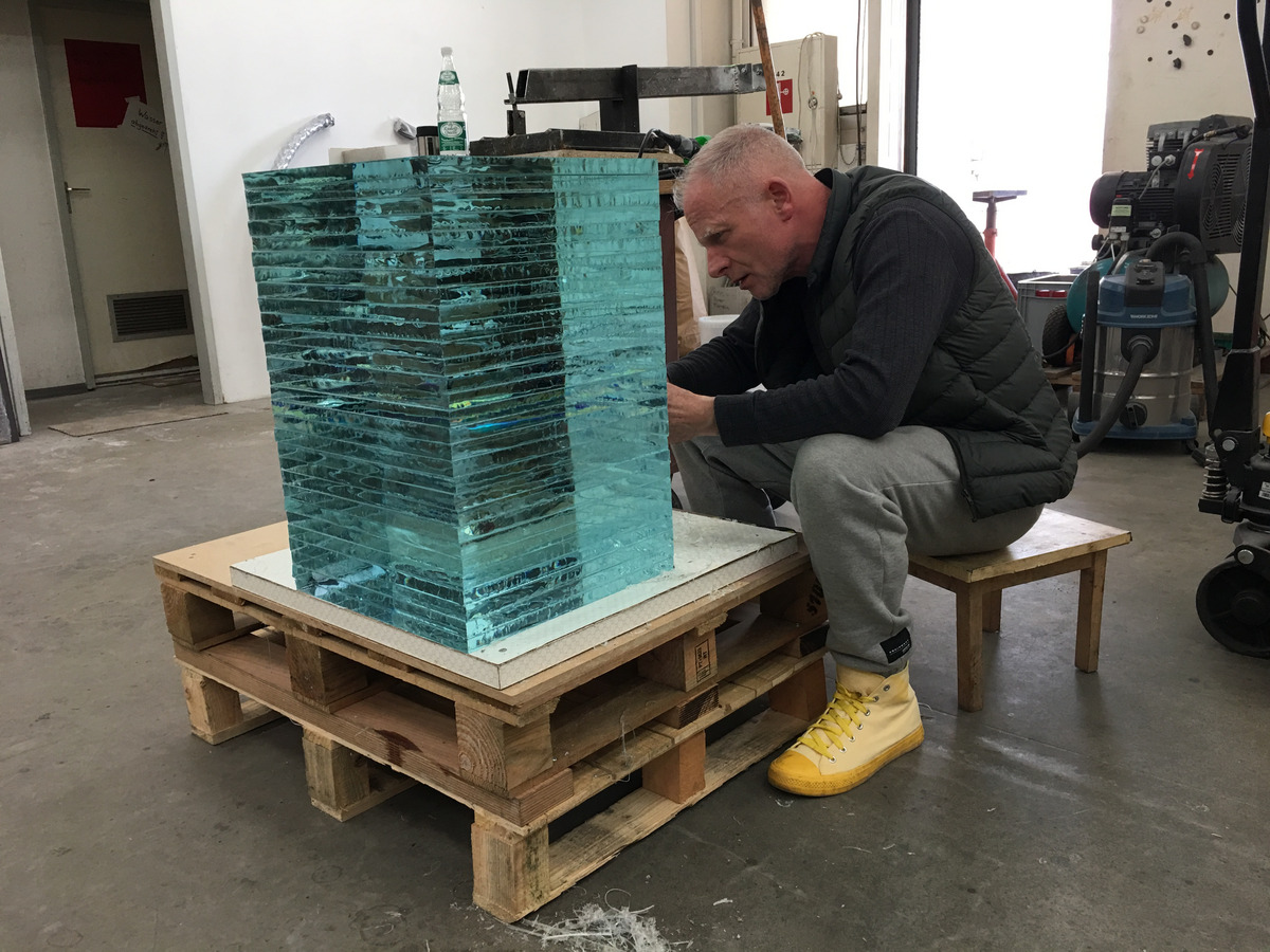 Ein Steinbildhauer, der einen Glasblock mit Hammer, Meißel und Pressluftmeißel bearbeitet? Der Nürnberger Bildhauer Till Augustin tut genau das mit Hilfe einer neuen Technik und entsprechendem Know-how. Seine Erfindung: Er verklebt industriell hergestellte 19 Millimeter dicke transparente Floatglasscheiben miteinander. Daraus entstehen stabile, aquamarin leuchtende Quader, die dann einer oftmals harrschen Bearbeitung ausgesetzt werden.