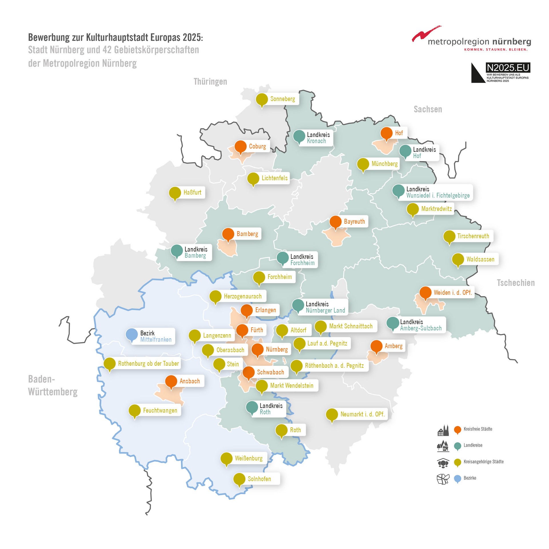 Die Einbindung der Metropolregion Nürnberg ist ein zentrales Wesensmerkmal der Kulturhauptstadt-Bewerbung der Stadt Nürnberg. Ziel ist es, die Region über zukunftweisende Kooperationsprojekte nachhaltig voranzubringen. Innovative Kulturprojekte und Kooperationsmodelle zwischen Kommunen, Städten und Landkreisen sollen im Rahmen der Bewerbung entwickelt und umgesetzt werden. 42 Gebietskörperschaften haben sich bereits der Nürnberger Bewerbung angeschlossen und bringen sich aktiv in die Programmgestaltung ein. Derzeit arbeiten ca. 150 Beteiligte in sechs Arbeitsgruppen an der Entwicklung regionaler Projekte für das Bewerbungsbuch.