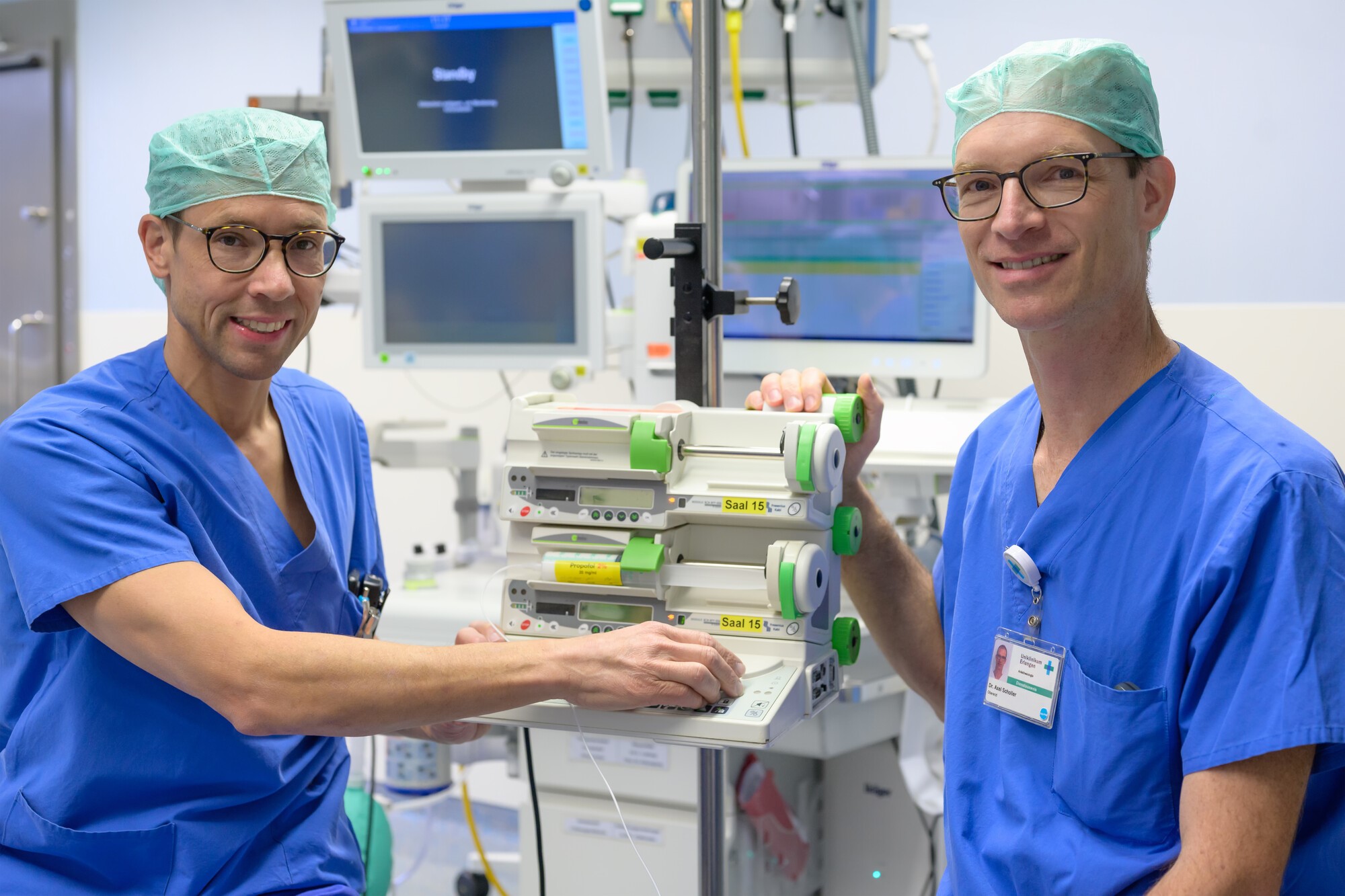 Die Oberärzte Dr. Christopher Schmitt (l.) und Dr. Alex Scholler der Anästhesiologischen Klinik (Direktor: Prof. Dr. Roland E. Francis) des Uniklinikums Erlangen demonstrieren in einem unbenutzten OP-Saal die Anwendung von Propofol, das seit der Umstellung auf nachhaltige Narkosen als Standardverfahren mittels TIVA (Totale Intravenöse Anästhesie) angewendet wird. (Foto: Michael Rabenstein/Uniklinikum Erlangen)