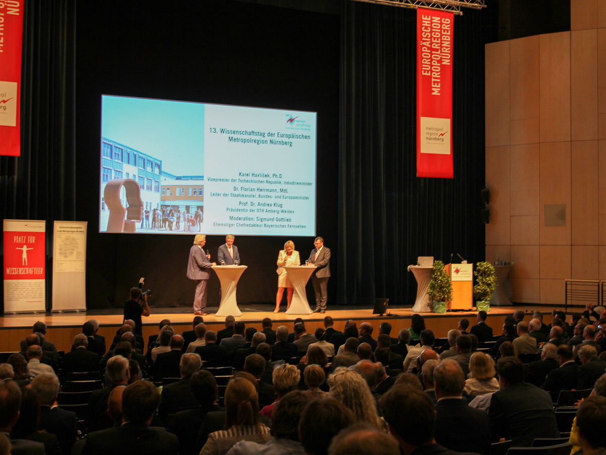 Treffpunkt für Wissenschaft, Wirtschaft, Politik und Bildung: Rund 700 Gäste kamen heute, 19. Juli in der Max-Reger-Halle Weiden zur größten Veranstaltung, dem „wissenschaftlichen Schaufenster“ der Metropolregion. Unter dem Motto „Gateway ländliche Räume“ wurden Kernthemen der Metropolregion in Fachvorträgen diskutiert; Arbeit und Bildung 4.0, Logistik, Gesundheit, Gateway Mittel- und Osteuropa, Energie, Technologie und Nachhaltigkeit.