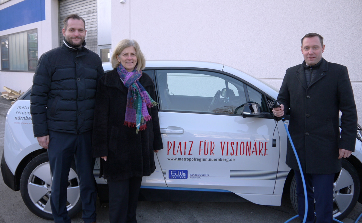 Der Ausbau der Ladeinfrastruktur für Elektro-Fahrzeuge in der Metropolregion Nürnberg nimmt richtig Fahrt auf: Aktuell stehen im Ladeverbund Franken+, der den Großteil der Metropolregion abdeckt, bereits rund 140 Ladesäulen zur Verfügung. Weitere 100 Säulen sollen im Jahr 2017 hinzukommen. Auch der neue Dienstwagen der Metropolregion – ein BMW i3 – fährt elektrisch. Im Rahmen eines Sponsorings stellt das Laufer Autozulieferer-Unternehmen EuWe Eugen Wexler GmbH den Wagen kostenlos zur Verfügung. Bei einem Pressetermin an der firmeneigenen Ladesäule wurde das Fahrzeug jetzt vorgestellt.