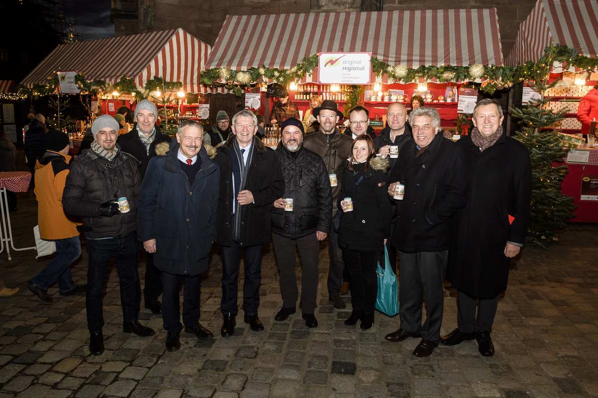 Freunde und Förderer der Metropolregion Nürnberg treffen sich zum „After-Work-Glühwein“ an den Ständen von Original Regional auf dem Nürnberger Christkindlesmarkt.