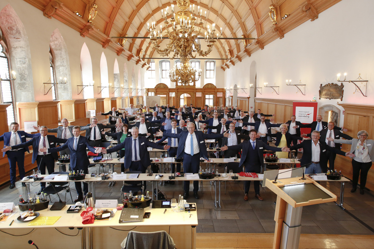 Nach den Kommunalwahlen im Frühjahr kam am Freitag, 17. Juli erstmals der Rat der Metropolregion Nürnberg im Historischen Rathaussaal in Nürnberg zusammen. 16 neu gewählte KommunalpolitikerInnen schlossen in die Reihen der insgesamt 57 LandrätInnen, OberbürgermeisterInnen und BürgermeisterInnen der Region auf, und gestalten fortan gemeinsam mit ihren AmtskollegInnen die Geschicke der regionalen Allianz. Als Zeichen der Verbundenheit erhielten sie eine sportliche Team-Jacke der Metropolregion Nürnberg.