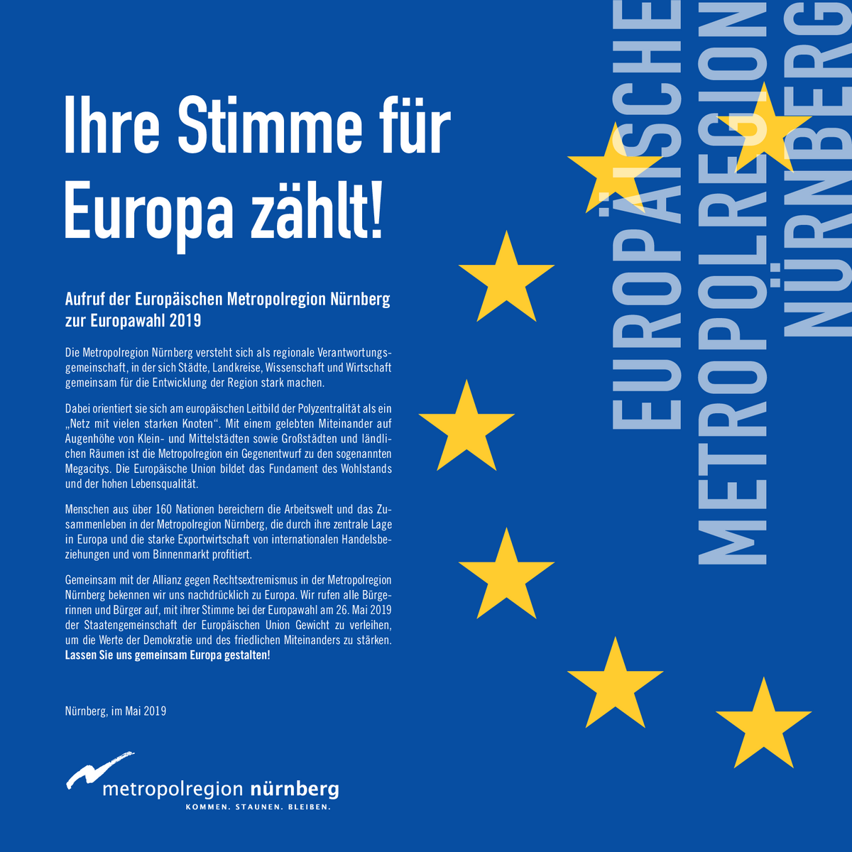 Um die Bedeutung der europäischen Staatengemeinschaft und der Europawahl am 26. Mai zu betonen, haben sich rund 60 OberbürgermeisterInnen, LandrätInnen, BürgermeisterInnen und Mitglieder der Fachgremien der Europäischen Metropolregion Nürnberg eine gemeinsame Erklärung verfasst. Sie appellieren an die Bürgerinnen und Bürger am 26. Mai zur Wahl zu gehen, um der Europäischen Union Gewicht zu verleihen und die Werte der Demokratie und des friedlichen Miteinanders zu stärken.