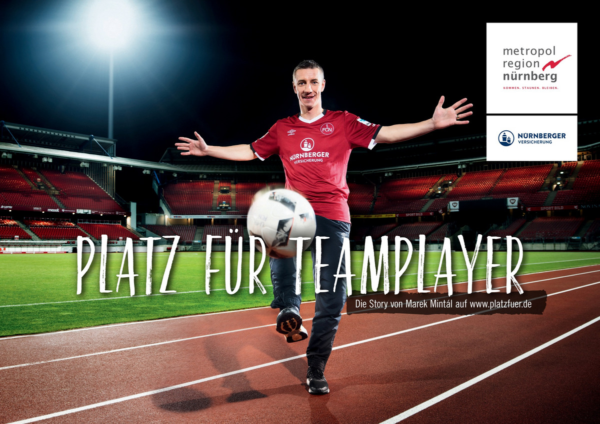 Er kam im Jahr 2003 aus der Slowakei zum 1. FC Nürnberg, wurde zum Torschützenkönig der Fußball-Bundesliga und zur Identifikations-Figur des Club. Auch nach dem Ende seiner aktiven Karriere blieb Marek Mintál der Metropolregion Nürnberg treu – mit Ehefrau Katharina und den Kindern Jakub, Sebastian und Sarah wohnt Mintál noch immer in Nürnberg. Die Metropolregion Nürnberg ist ihm zur zweiten Heimat geworden. Keine Frage, dass er bereit war, unter dem Titel „Platz für Teamplayer“ in der Mitmachkampagne „Platz für…“ aufzutreten. In der Halbzeitpause des Spiels 1. FC Nürnberg-Eintracht Braunschweig wurde den Club-Fans das neue Kampagnen-Motiv jetzt im Stadion vorgestellt.