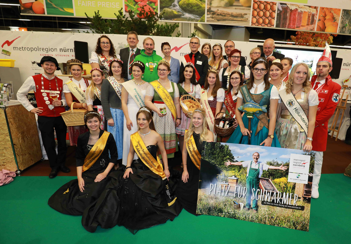 Royaler Glanz auf der Consumenta: Zum Tag der Metropolregion am Mittwoch, 31. Oktober, reisten heute 30 Hoheiten an. Aus allen Himmelsrichtungen sind sie gekommen – von der Oberfränkischen Bierkönigin (Landkreis Hof), der Fränkischen Spargelkönigin (Landkreis Roth) bis zum Neumarkter Weinkönig und der Fränkischen Apfelkönigin (Landkreis Kitzingen) – um in persona die Vielfalt der Regionalprodukte und Kulturlandschaften in der Metropolregion darzustellen.