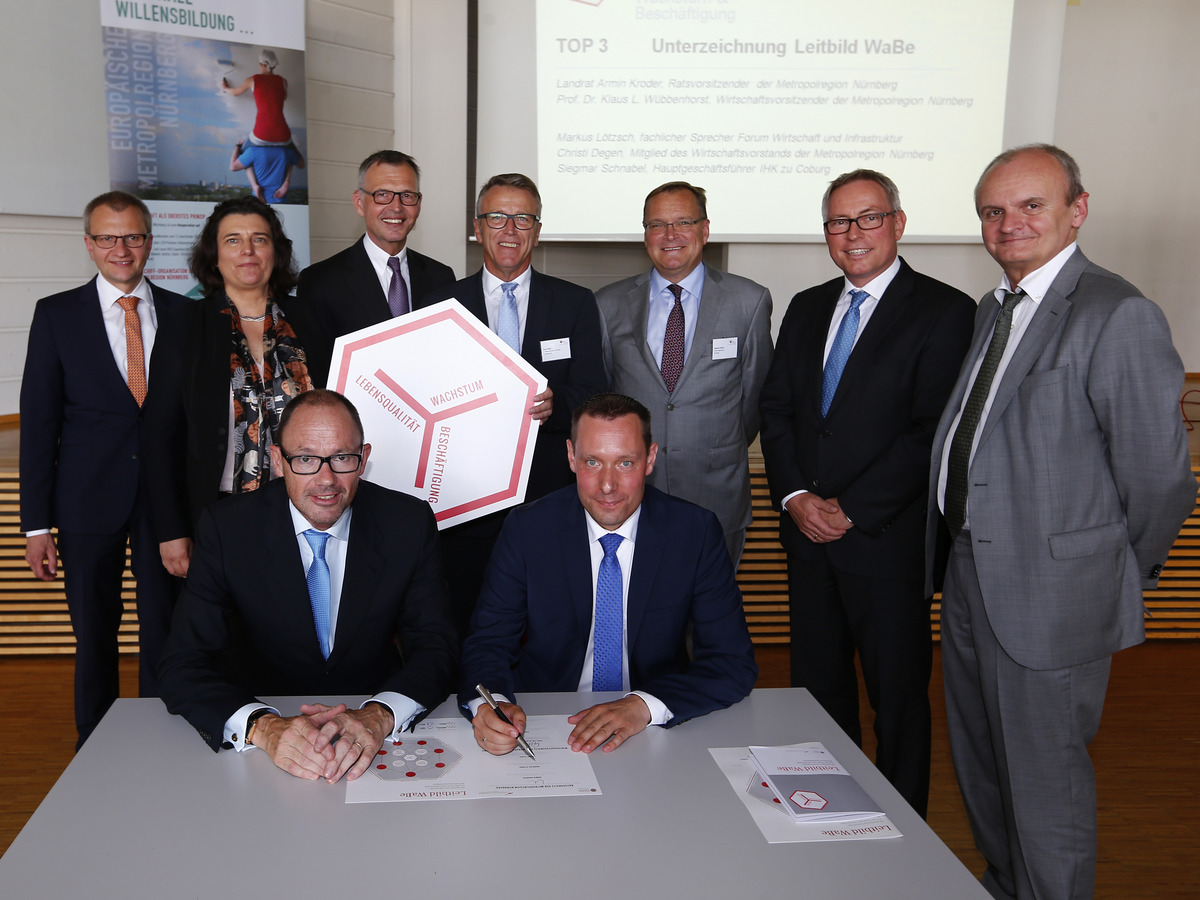 Im Rahmen der Ratssitzung am Wissenschaftstag der Metropolregion Nürnberg am 22. Juli 2016 in der Universität Bayreuth ist das fortentwickelte Leitbild für nachhaltiges Wachstum und Beschäftigung der Europäischen Metropolregion Nürnberg (Leitbild WaBe) feierlich unterzeichnet worden. Das Leitbild wurde von Verantwortlichen aus Politik, Wirtschaft und Wissenschaft gemeinsam erarbeitet und wirkt richtungsweisend für die strategische Entwicklung der Metropolregion Nürnberg.