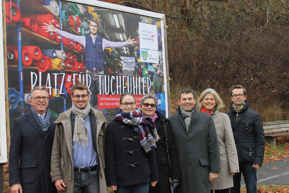Unter dem Titel „Platz für Tuchfühler“ werden Maximilian Mehler und seine Traditions-Firma jetzt zu Botschaftern der Mitmachkampagne „Platz für“ der Metropolregion Nürnberg. Im Beisein von Bürgermeister Franz Stahl wurde das neue Motiv vor einem Großflächen-Plakat in der Tirschenreuther Mühlbühlstraße vorgestellt.